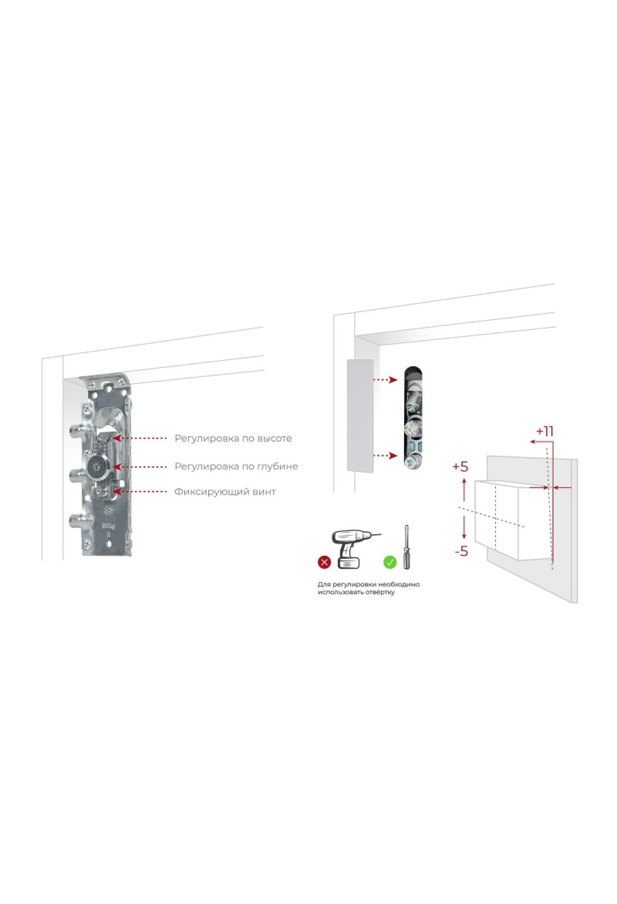 Винты для регулировки позволяют корректировать положение модуля по высоте в диапазоне +/- 5 мм, по глубине до 11 мм от плоскости стены.