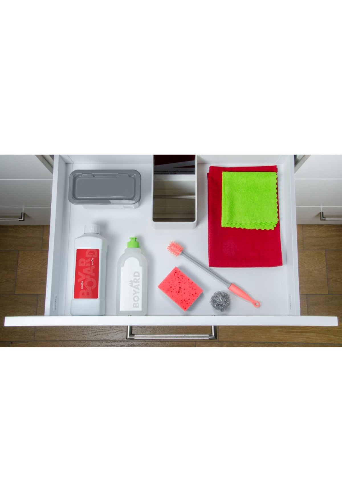 Держатель не ограничивает конструкцию мебельного ящика и не требует расположения строго по центру. Тонкая форма стенок изделия позволит максимально практично использовать внутреннее пространство ящика для хранения кухонных принадлежностей.
