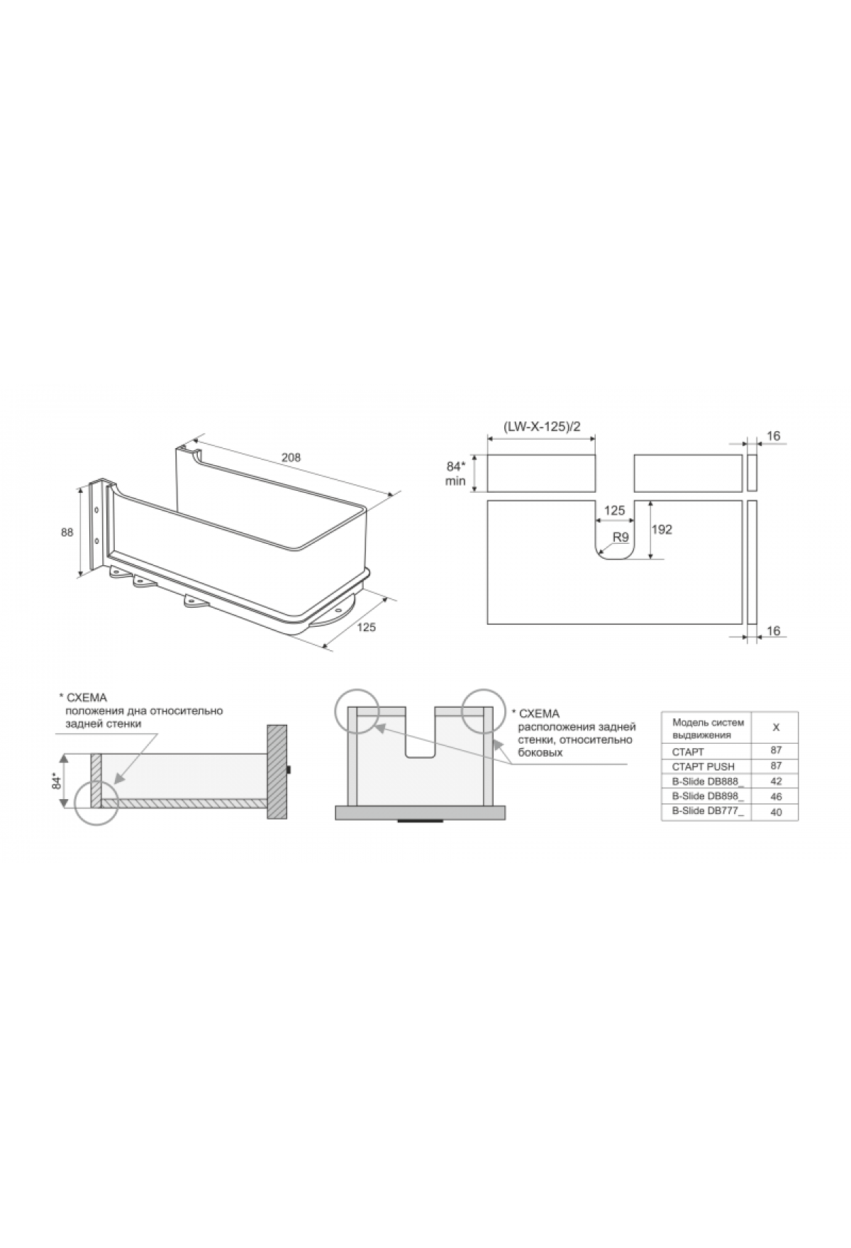 Конструкция изделия совместима с системами выдвижения СТАРТ SOFT и СТАРТ PUSH с прямыми боковинами стандартной высоты, а также может быть использована в мебели на направляющих других моделей, например, линейки B-SLIDE.