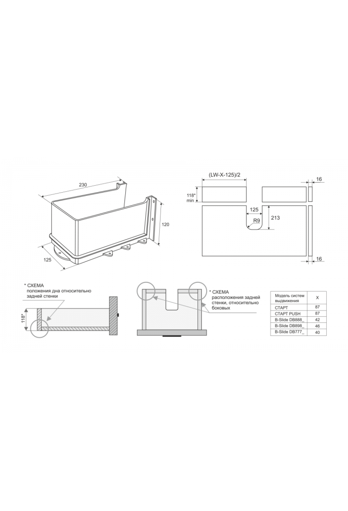 Конструкция изделия совместима с системами выдвижения СТАРТ SOFT и СТАРТ PUSH с прямыми боковинами средней высоты, а также может быть использована в мебели на направляющих других моделей, например, линейки B-SLIDE.