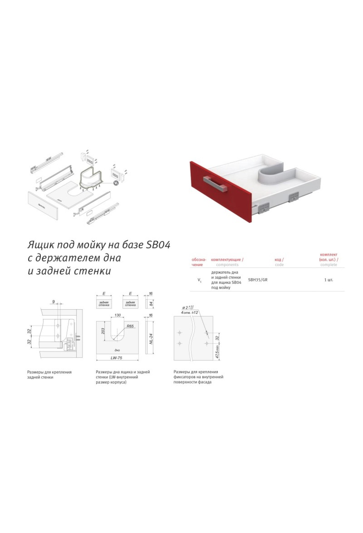 SBH35 – держатель дна и задней стенки для выдвижного ящика под мойку. SBH35 предназначен для изготовления ящика под мойку. Держатель фиксирует дно и заднюю стенку выдвижного ящика, формируя глубокий удобный и эргономичный выдвижной ящик вокруг смесителя под мойкой. Высота держателя SBH35 соответствует высоте металлической боковины стандартного ящика. Держатель дна и задней стенки SBH35/GR ящика под мойку сделан из прочного и безопасного пластика, что актуально в условиях повышенной влажности пространства под мойкой. Держатель SBH35/GR предложен в нейтральном сером цвете, который отлично сочетается с другими частями выдвижного ящика вокруг мойки.