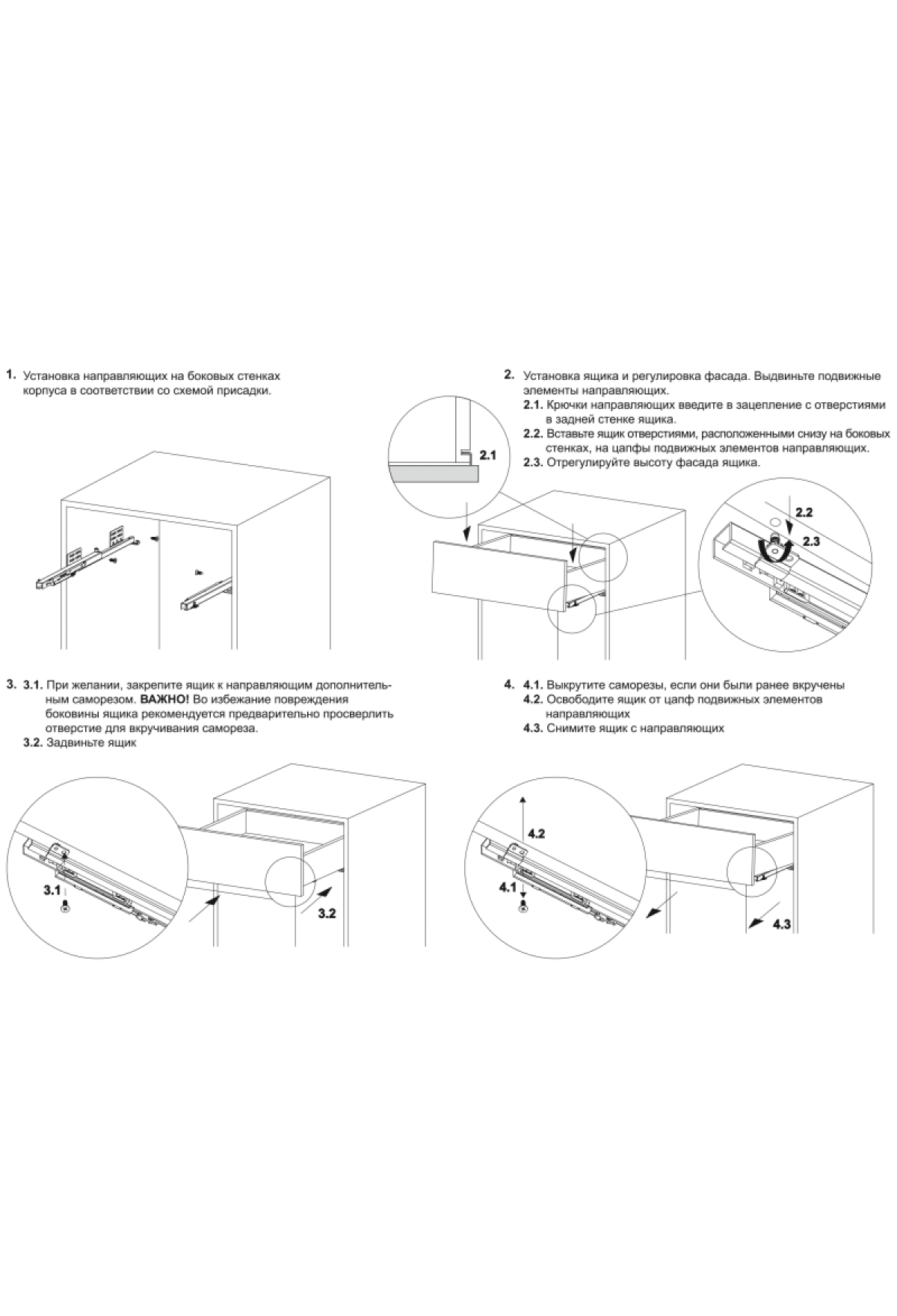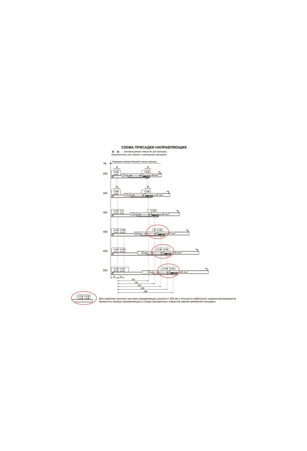 Для наиболее прочного монтажа направляющих длиной от 400 мм к плоскости мебельного изделия рекомендуется прикрутить каждую направляющую в 2 ряда присадочных отверстий задней крепёжной площадки.