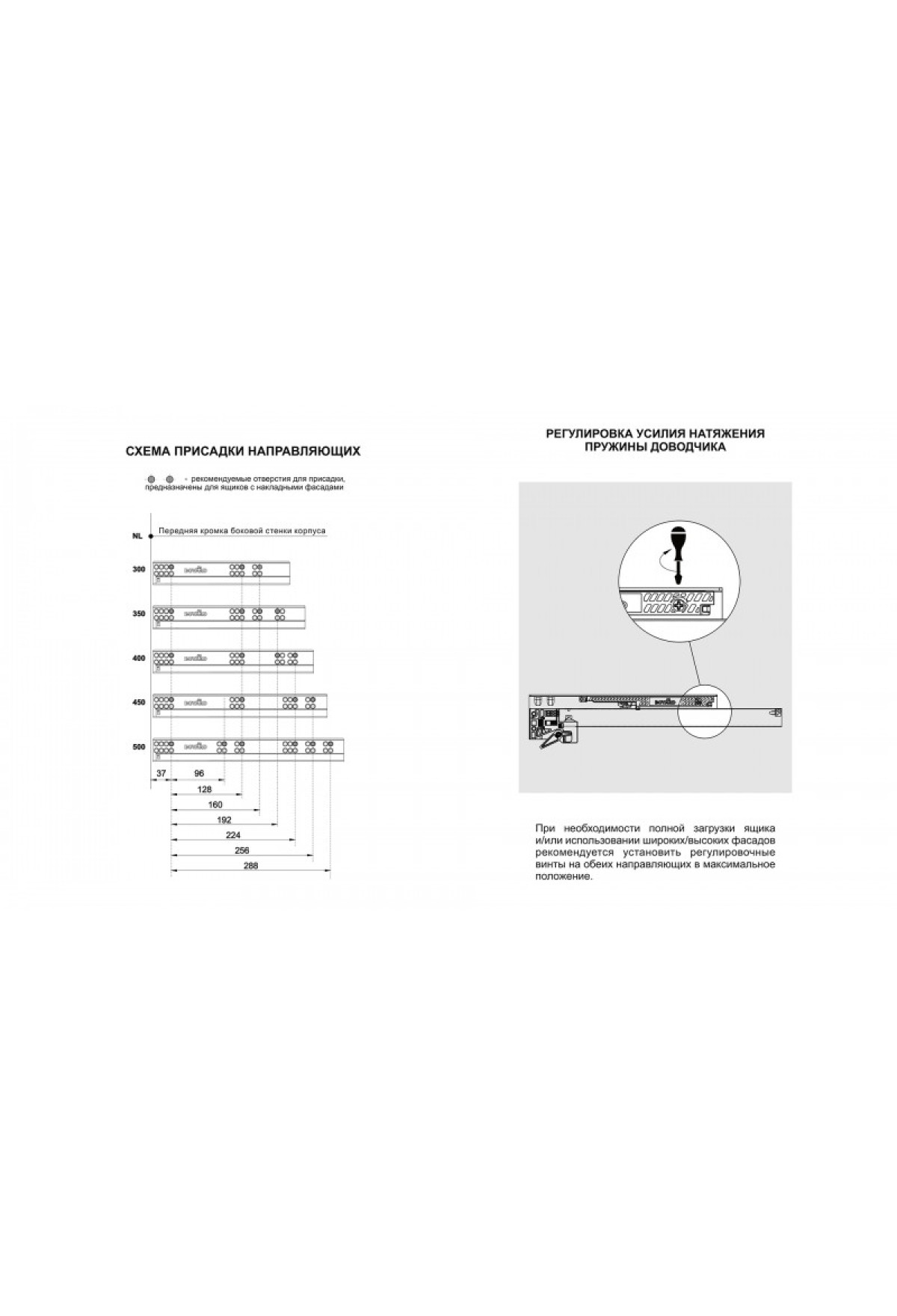 - Неравномерное распределение веса, сконцентрированное у фасада ящика. Такое бывает, когда неглубокий ящик имеет высокий и тяжелый фасад толщиной от 18 мм. Небольшие ящики с габаритными фасадами применяются в мебели малых форм: ванные комнаты, прихожие, тумбы. При большом весе, сконцентрированном у фасада неглубокого ящика, доводчику тяжелее работать, и он может не дотягивать ящик до самого конца. Чтобы устранить проблему нужно установить регулировочные винты на обеих направляющих в максимальное положение.