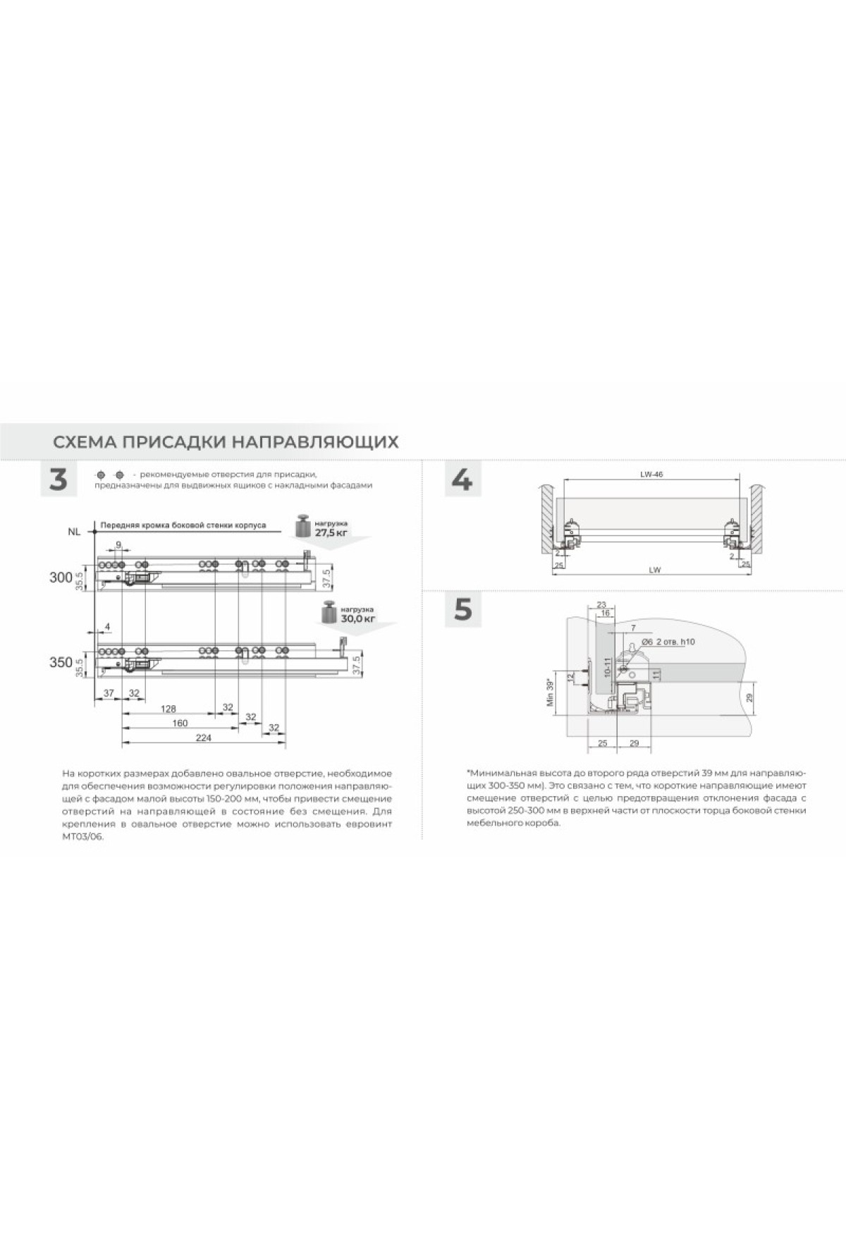 Схема установки DB9991 с короткой монтажной длиной 300-350 мм отличается от схемы установки размеров 400-500 мм. При нанесении разметки на корпус мебели чётко следуйте инструкции! Разница в монтаже коротких и больших длин заключается в значении min отступа от дна мебельного корпуса до верхнего ряда присадочных отверстий направляющей. У неглубоких моделей, до 350 мм включительно, это значение составляет min 39 мм. Установка по схеме позволяет достичь зазора в 2 мм между мебельным корпусом и направляющей. Именно корректный монтаж в соответствие со схемой позволяет избежать отклонения фасада с высотой 250-300 мм в верхней части от плоскости торца боковой стенки мебельного изделия.