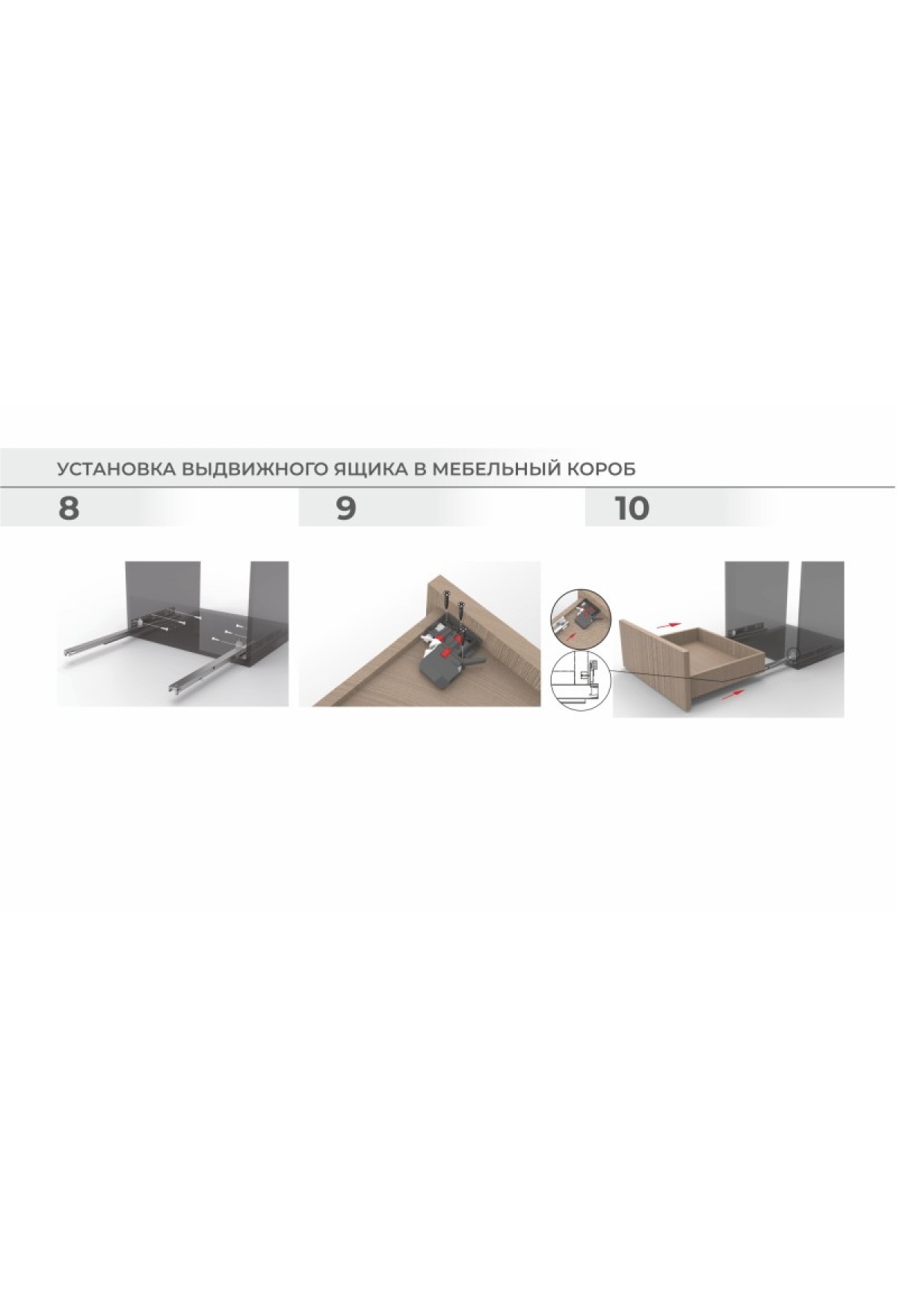 Направляющие DB9991 обладают встроенным механизмом синхронизации, расположение деталей в котором может смещаться в процессе транспортировки. Перед осуществлением монтажа направляющих рекомендуем вытянуть каждую до полного выдвижения. В процессе может быть необходимо приложить контролируемое усилие для перевзвода, при котором можно будет слышать характерные щелчки.