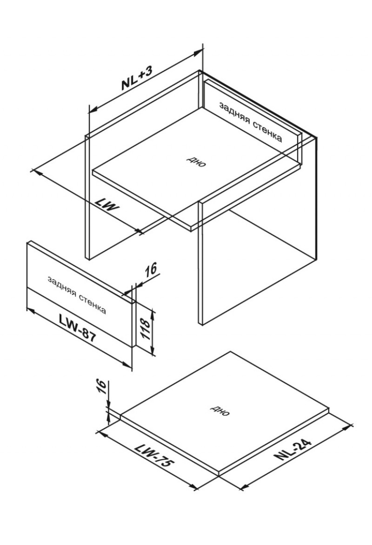 Для сборки выдвижного мебельного ящика с помощью боковин SBDW12 необходимо самостоятельно изготовить фасад, заднюю стенку и дно ящика с учетом собственных пожеланий и потребностей по ширине и высоте готового ящика.