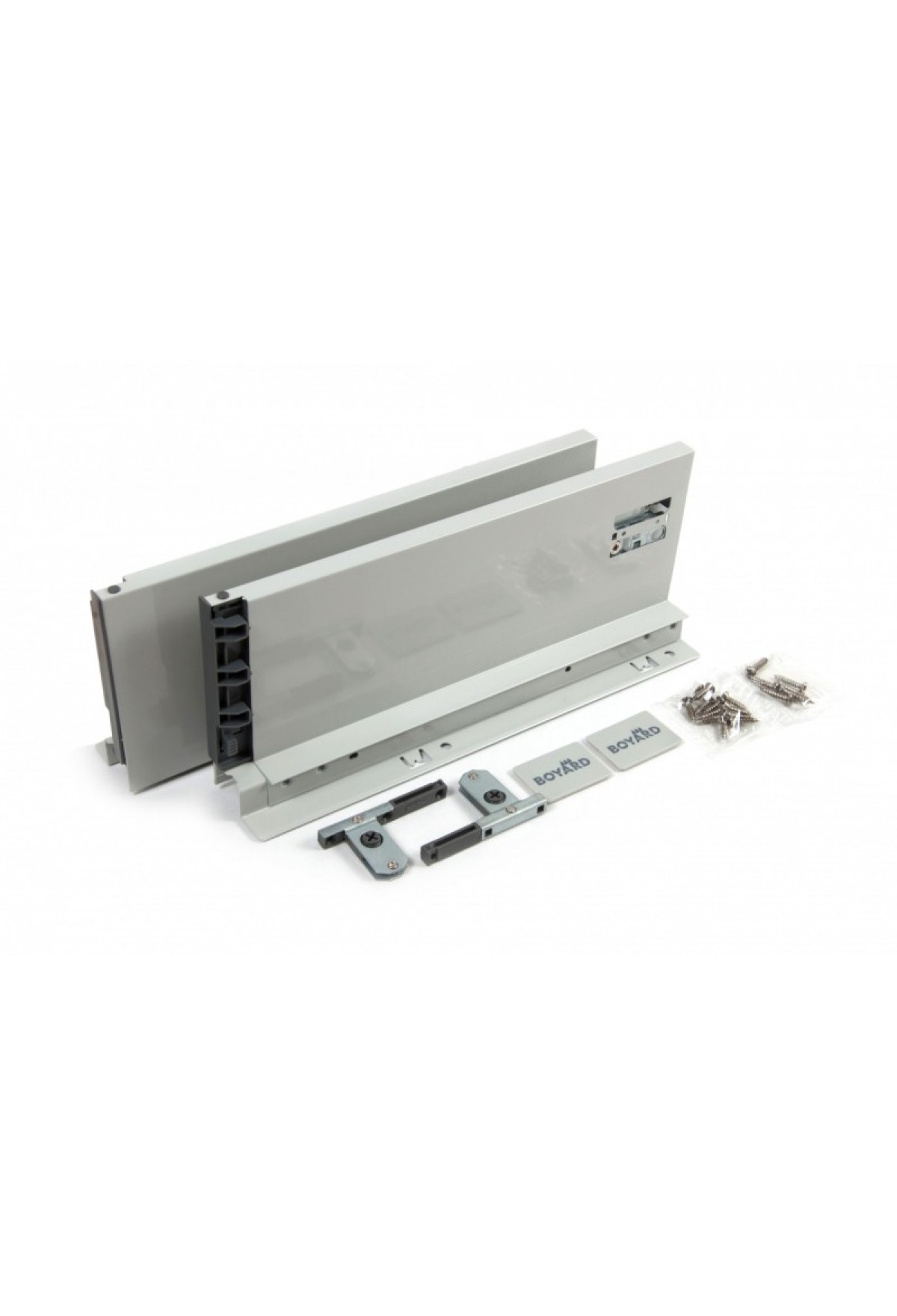 Боковины с держателями задней стенки и фиксаторами фасада выполняют защитно-декоративную функцию, а также соединяют между собой основные элементы выдвижного ящика: передняя фасадная панель, задняя стенка и дно. Кроме этого, боковины выполняют функцию регулировки фасада выдвижного ящика, функцию подвижного крепления выдвижного ящика к опорной направляющей скрытого монтажа DB8181, предварительно установленной на боковой стенке непосредственно мебельного изделия и защищают от непреднамеренного снятия при полном выдвижении механизма. Боковые стенки SBDW12, покрытые порошковой эмалью методом распыления с последующей сушкой при температуре 90 градусов, прослужат весь эксплуатационный срок, даже в условиях агрессивной кухонной среды. В комплект также входят декоративные заглушки с логотипом BOYARD.