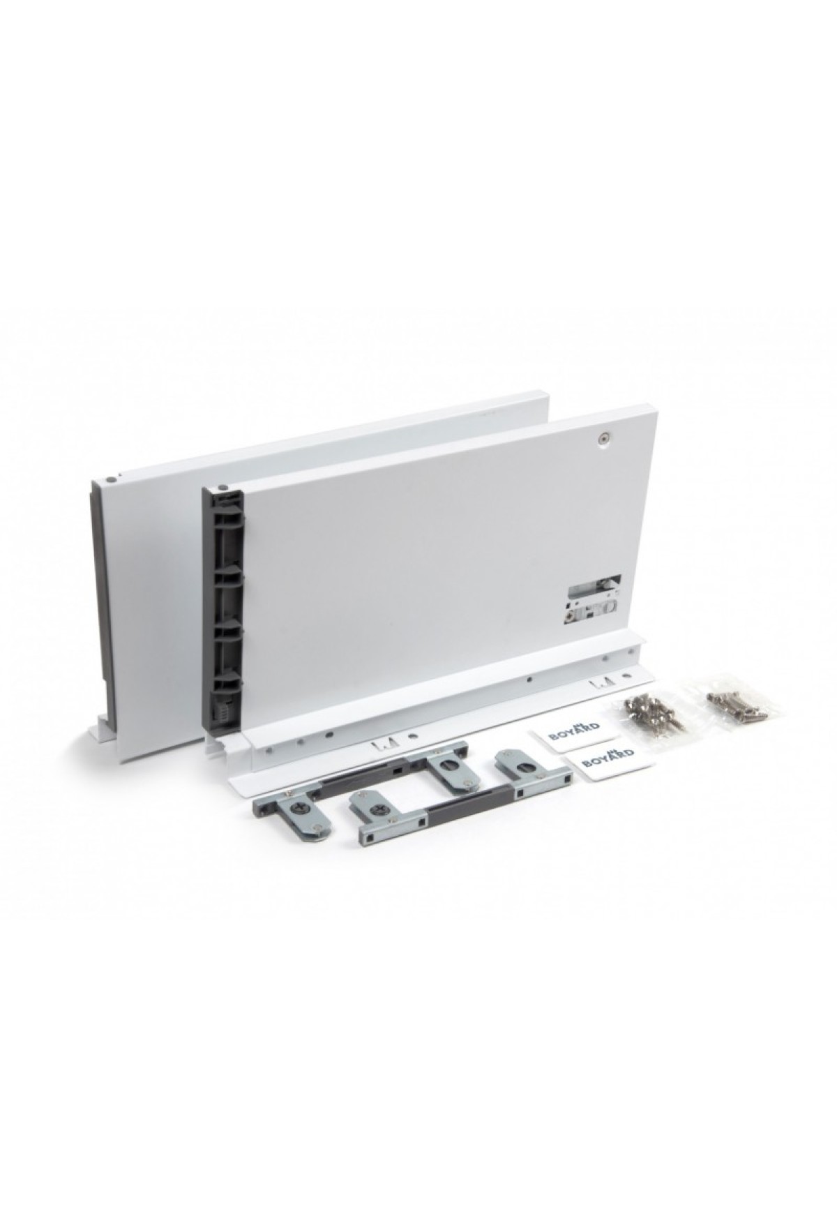 Боковины с держателями задней стенки и фиксаторами фасада выполняют защитно-декоративную функцию, а также соединяют между собой основные элементы выдвижного ящика: передняя фасадная панель, задняя стенка и дно. Кроме этого, боковины выполняют функцию регулировки фасада выдвижного ящика, функцию подвижного крепления выдвижного ящика к опорной направляющей скрытого монтажа DB8181, предварительно установленной на боковой стенке непосредственно мебельного изделия и защищают от непреднамеренного снятия при полном выдвижении механизма. Боковые стенки SBDW13, покрытые порошковой эмалью методом распыления с последующей сушкой при температуре 90 градусов, прослужат весь эксплуатационный срок, даже в условиях агрессивной кухонной среды. В комплект также входят декоративные заглушки с логотипом BOYARD.