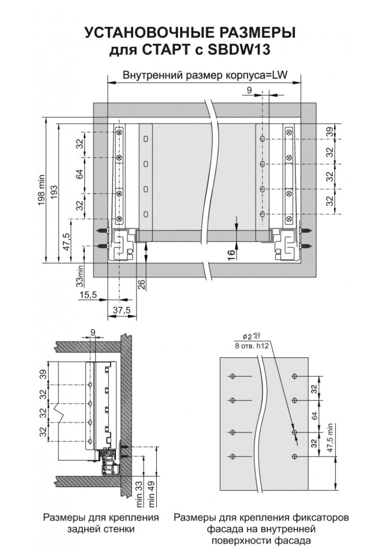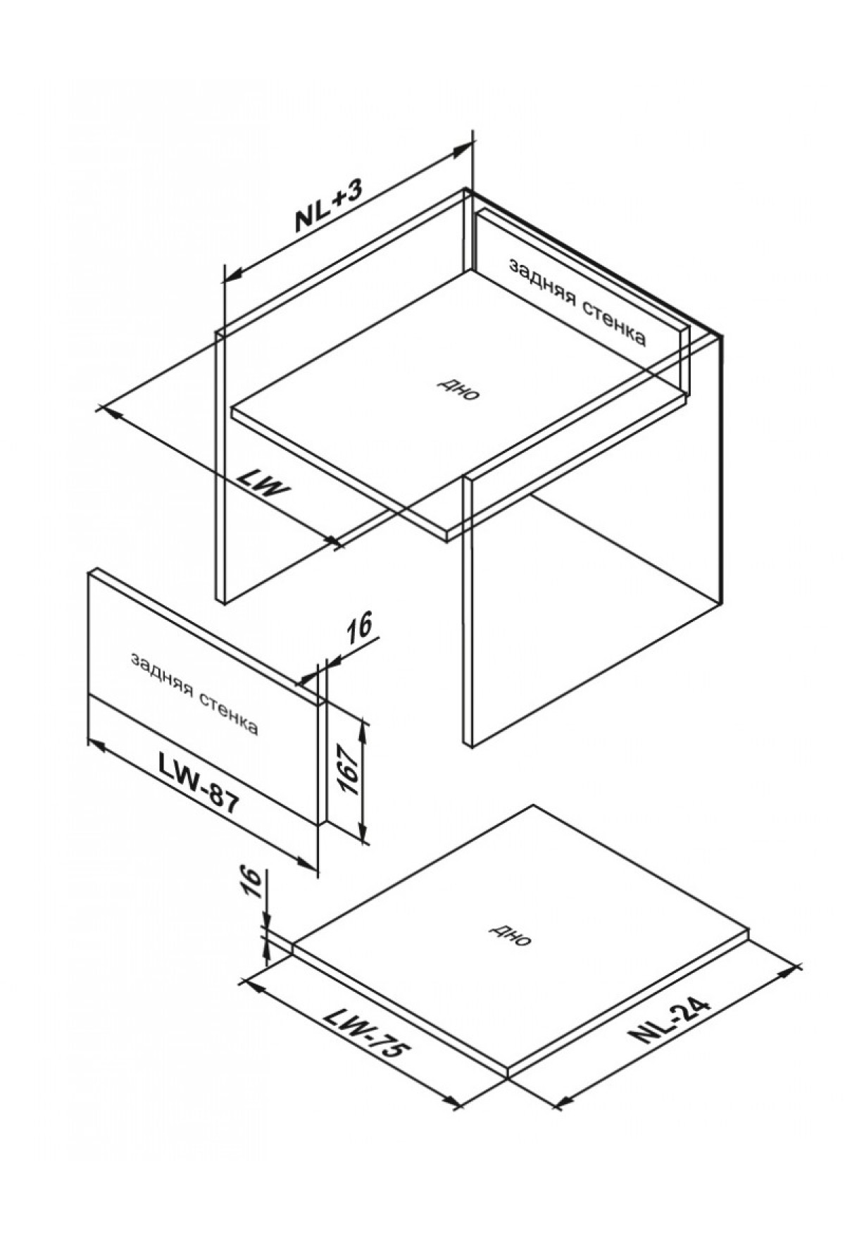 Для сборки выдвижного мебельного ящика с помощью боковин SBDW13 необходимо самостоятельно изготовить фасад, заднюю стенку и дно ящика с учетом собственных пожеланий и потребностей по ширине и высоте готового ящика.