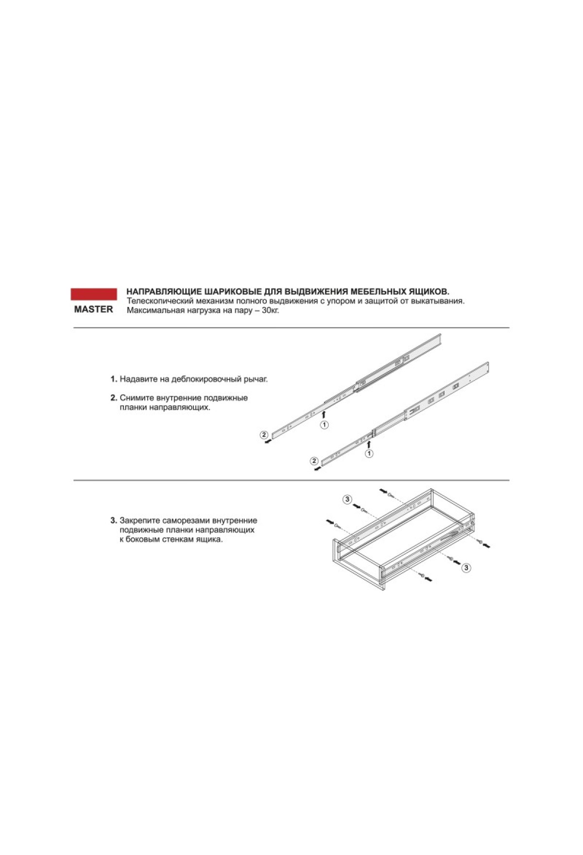 Master DB4504 обладает современными характеристиками и обеспечивает стабильную работу ящиков и плавный, равномерный ход, сравнимый по комфорту с движением современных систем выдвижения. Модель надежна и долговечна – она обладает оптимальной грузоподъемностью до 30 кг (зависит от монтажной длины) и гарантирует бесперебойную работу направляющей на протяжении более 50 000 циклов открывания/закрывания.