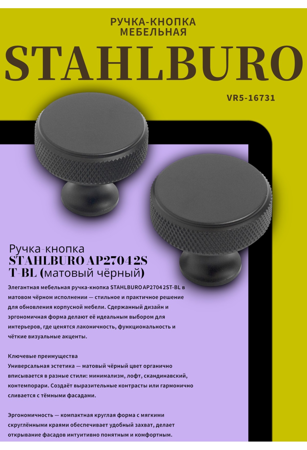Элегантная мебельная ручка‑кнопка STAHLBURO AP2704 2ST‑BL в матовом чёрном исполнении — стильное и практичное решение для обновления корпусной мебели. Сдержанный дизайн и эргономичная форма делают её идеальным выбором для интерьеров, где ценятся лаконичность, функциональность и чёткие визуальные акценты.