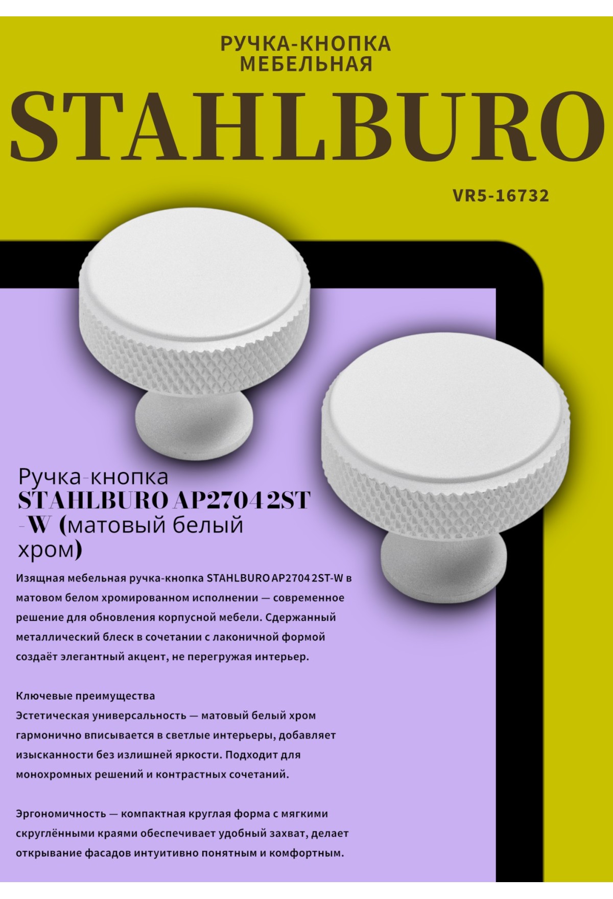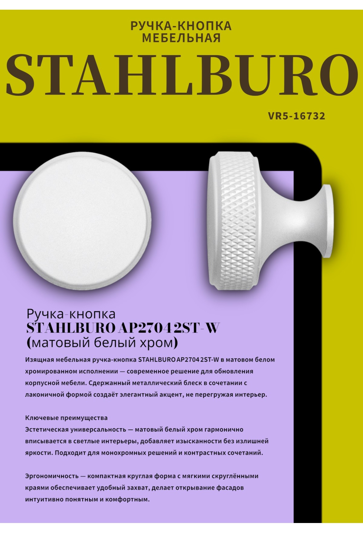 Изящная мебельная ручка‑кнопка STAHLBURO AP2704 2ST‑W в матовом белом хромированном исполнении — современное решение для обновления корпусной мебели. Сдержанный металлический блеск в сочетании с лаконичной формой создаёт элегантный акцент, не перегружая интерьер.