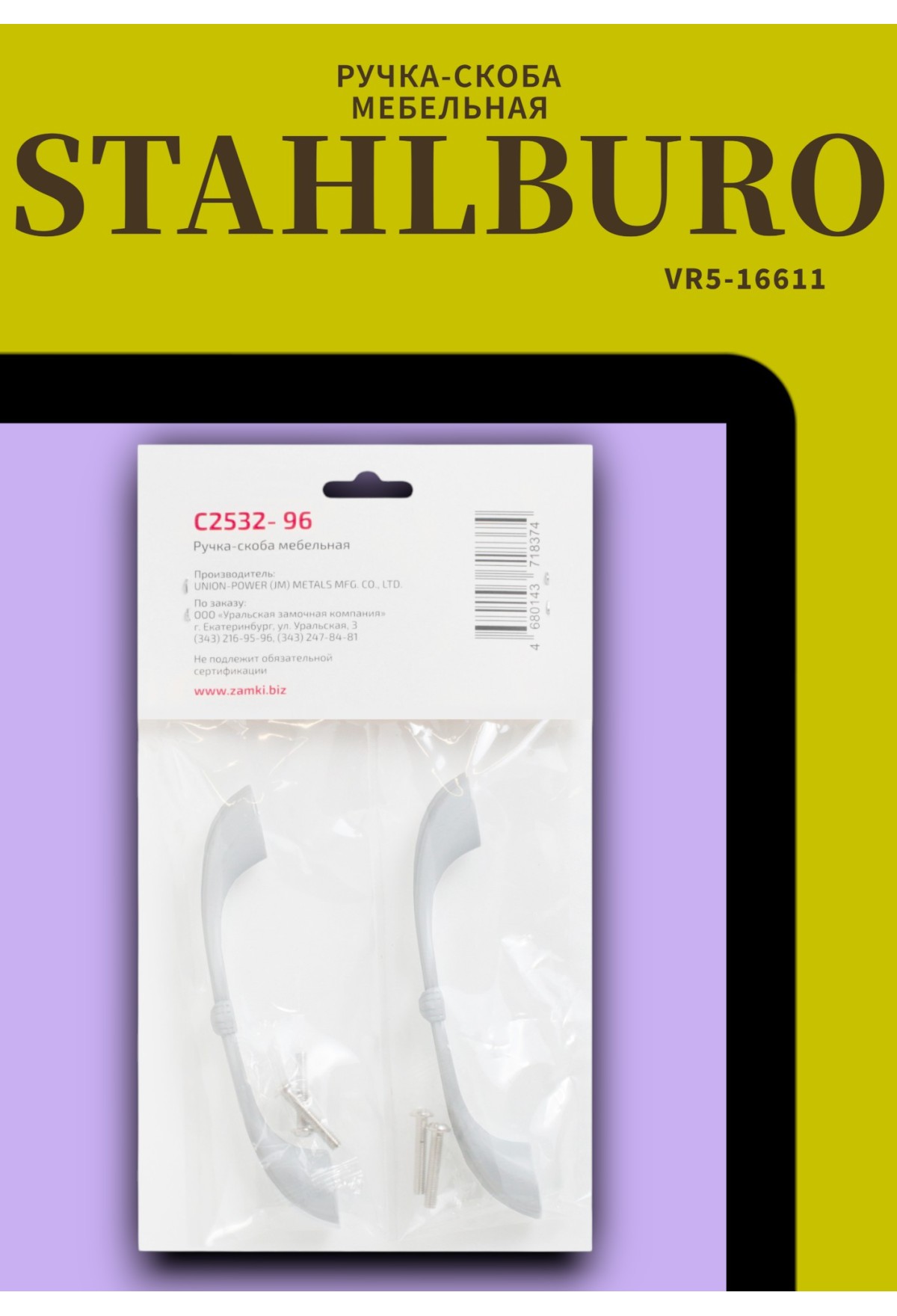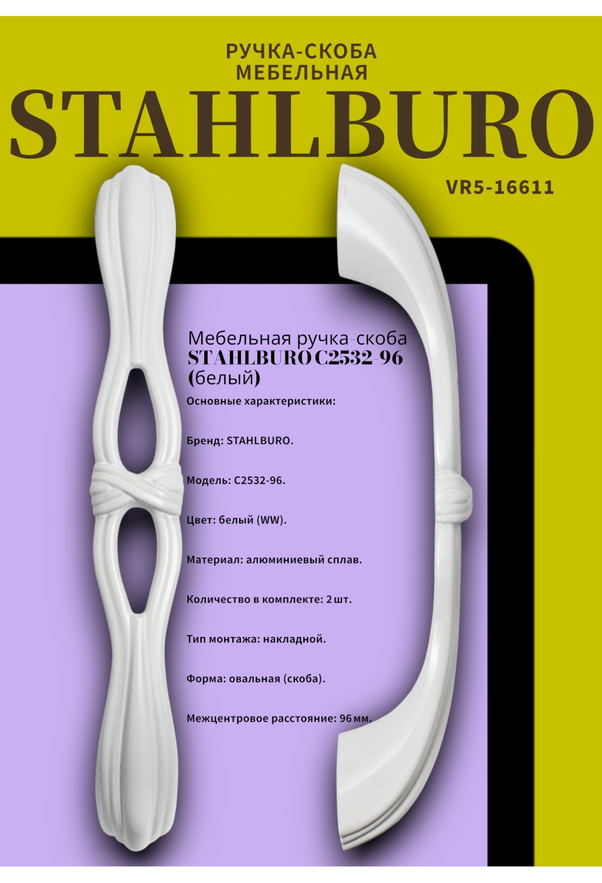 Мебельная ручка‑скоба STAHLBURO C2532‑96 (белый, 2 шт. в комплекте)