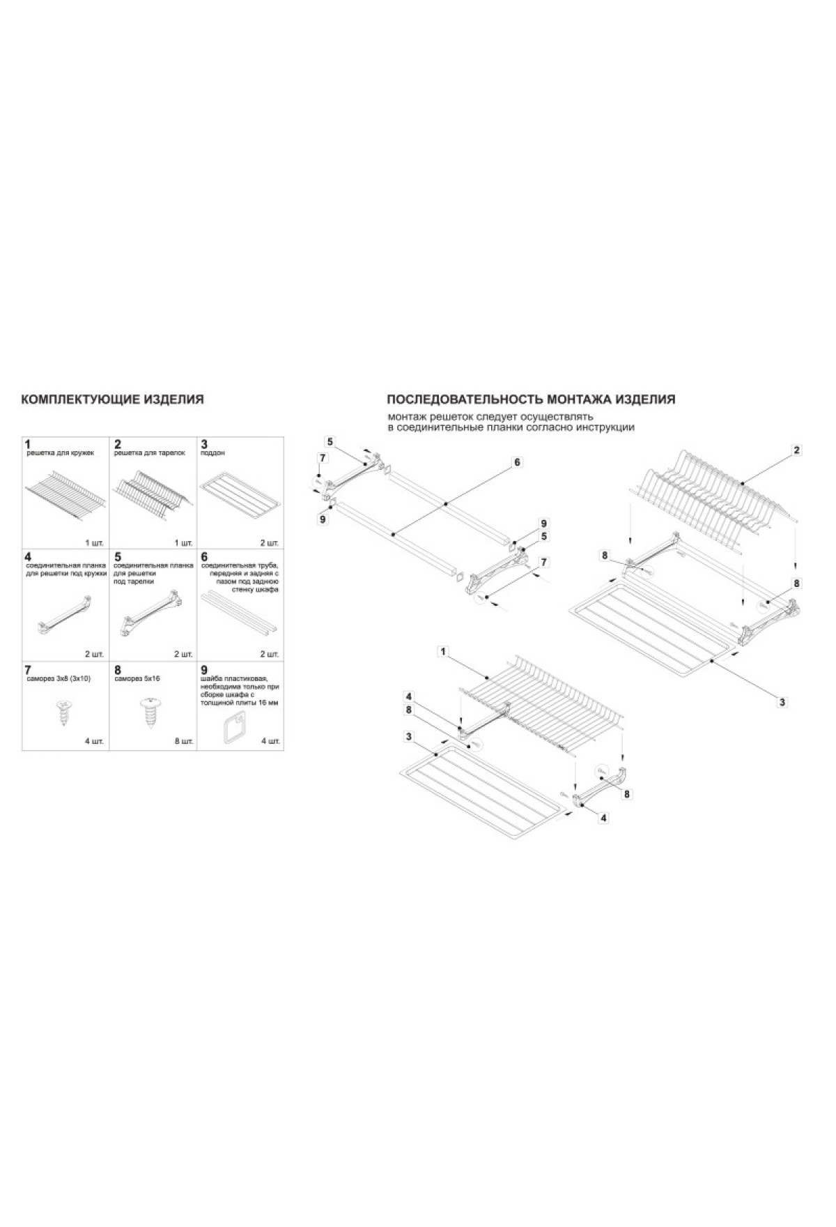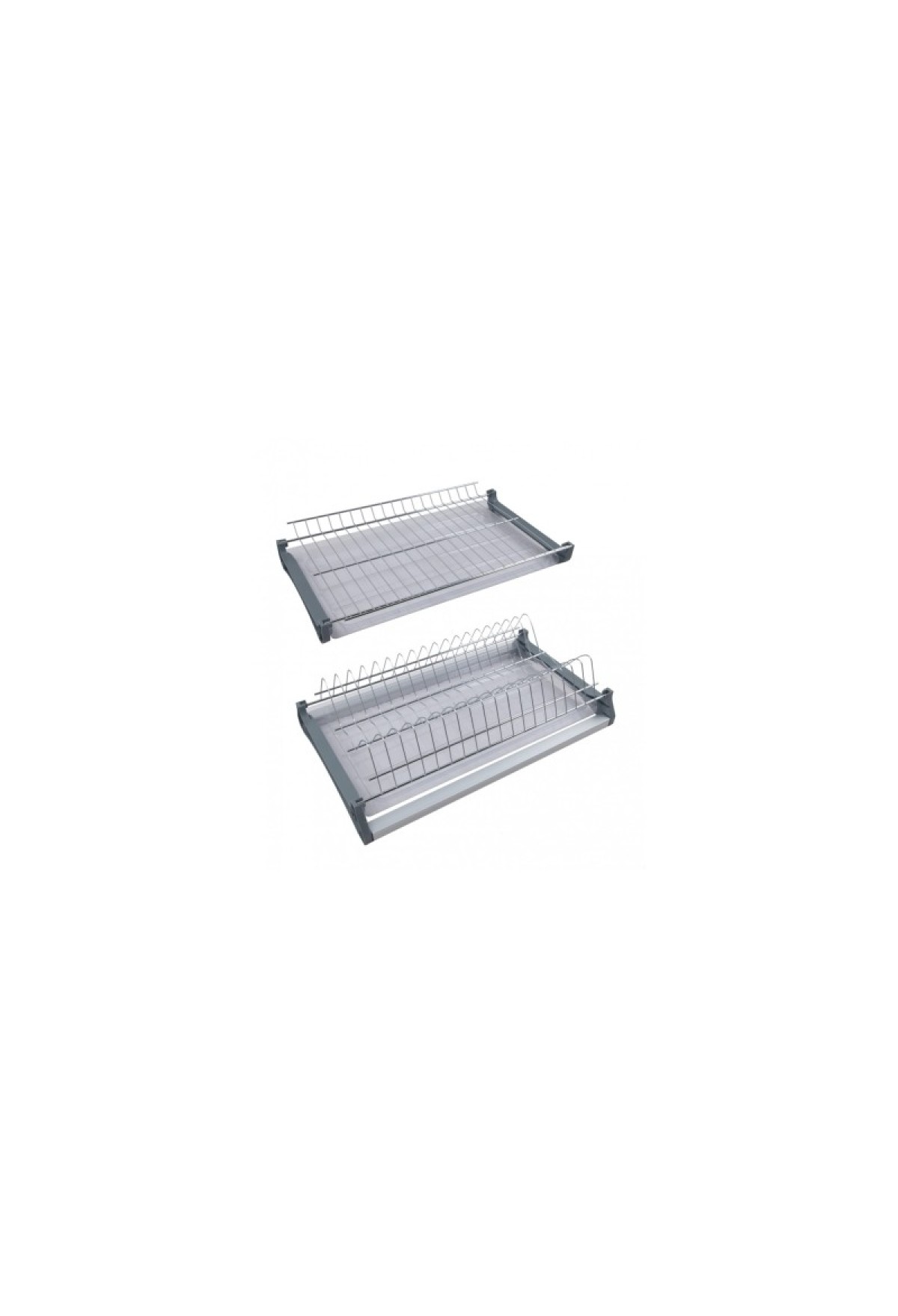 Комплект сушки включает 2 яруса для хранения посуды с надёжным гальваническим покрытием с эффектом хромирования, 2 съёмных поддона из качественного бесцветного пластика, 4 пластиковых серых держателя нижнего и верхнего уровней, переднюю и заднюю алюминиевые трубки, саморезы для монтажа сушки и крепления трубки.