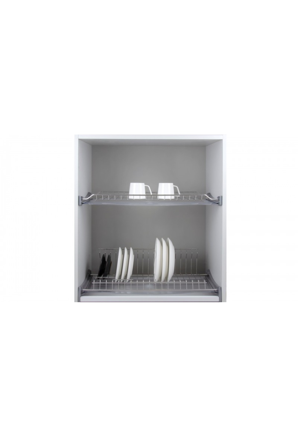 Нижний ярус сушки имеет L-образную форму для устойчивого размещения посуды, а поперечные прутки позволяют удерживать тарелки разного диаметра от 11 до 24 см.