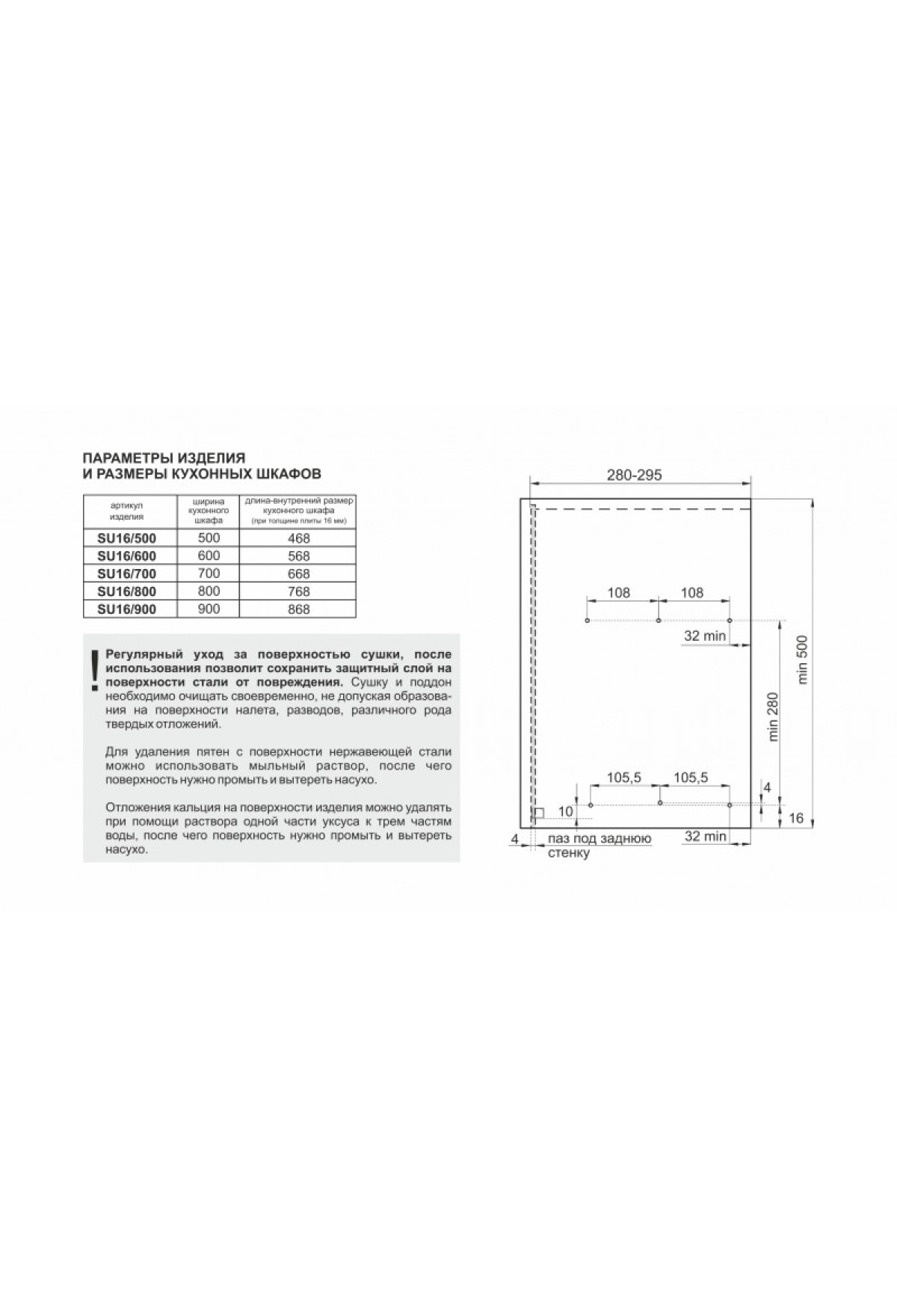При возникновении необходимости установки сушки SU16 GLORIA в мебельный короб c глубиной внутреннего пространства 295-305 мм, необходимо сдвинуть сушку в переднюю часть короба на 6 мм, относительно схемы установки, пересчитав присадочные размеры, для установки пластиковых держателей верхнего и нижнего уровня.