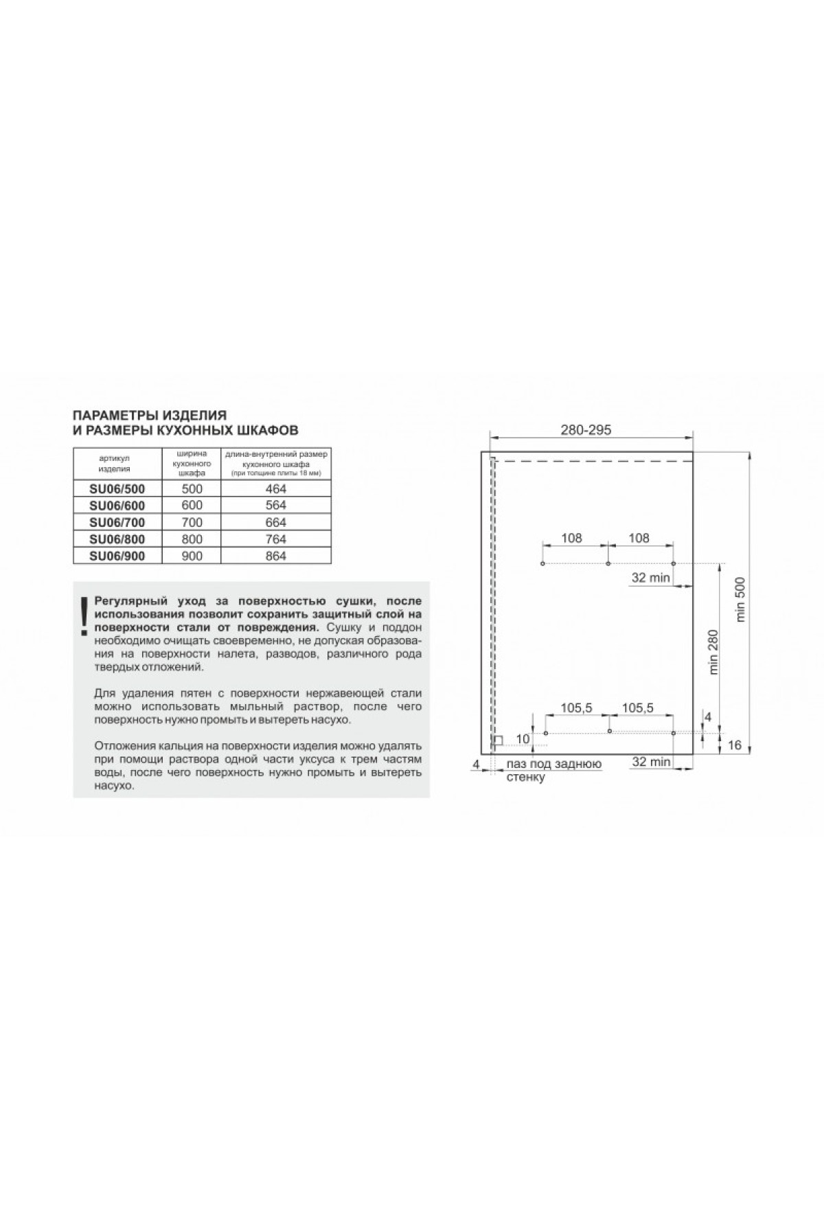 При возникновении необходимости установки сушки SU06 LORA в мебельный короб c глубиной внутреннего пространства 295-305 мм, необходимо сдвинуть сушку в переднюю часть короба на 6 мм, относительно схемы установки, пересчитав присадочные размеры, для установки пластиковых держателей верхнего и нижнего уровня.