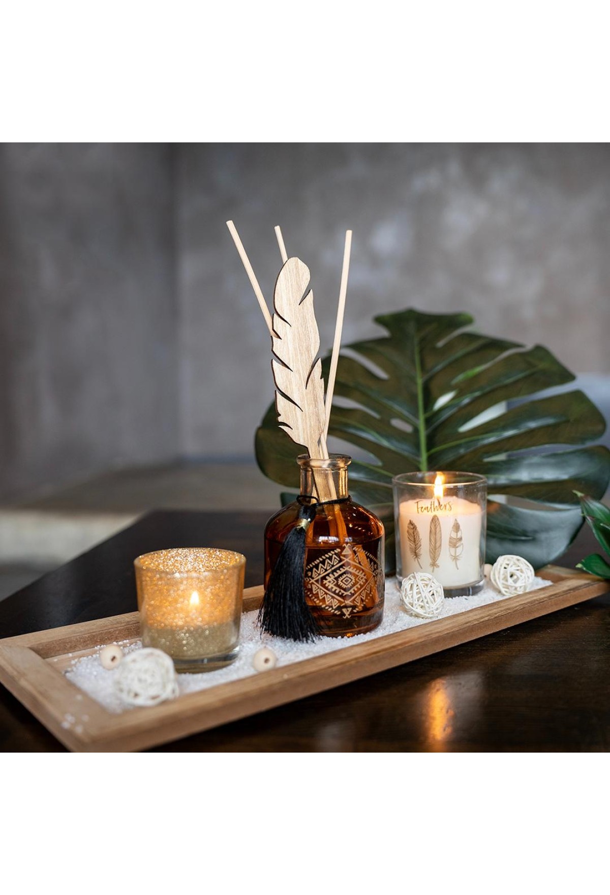 Набор состоит из аромадиффузора объемом 100 мл, палочек из ротанга в количестве 6 штук, ароматической свечи в стеклянном подсвечнике, подсвечника, чайной свечи-таблетки и деревянного подноса с декоративными камнями.