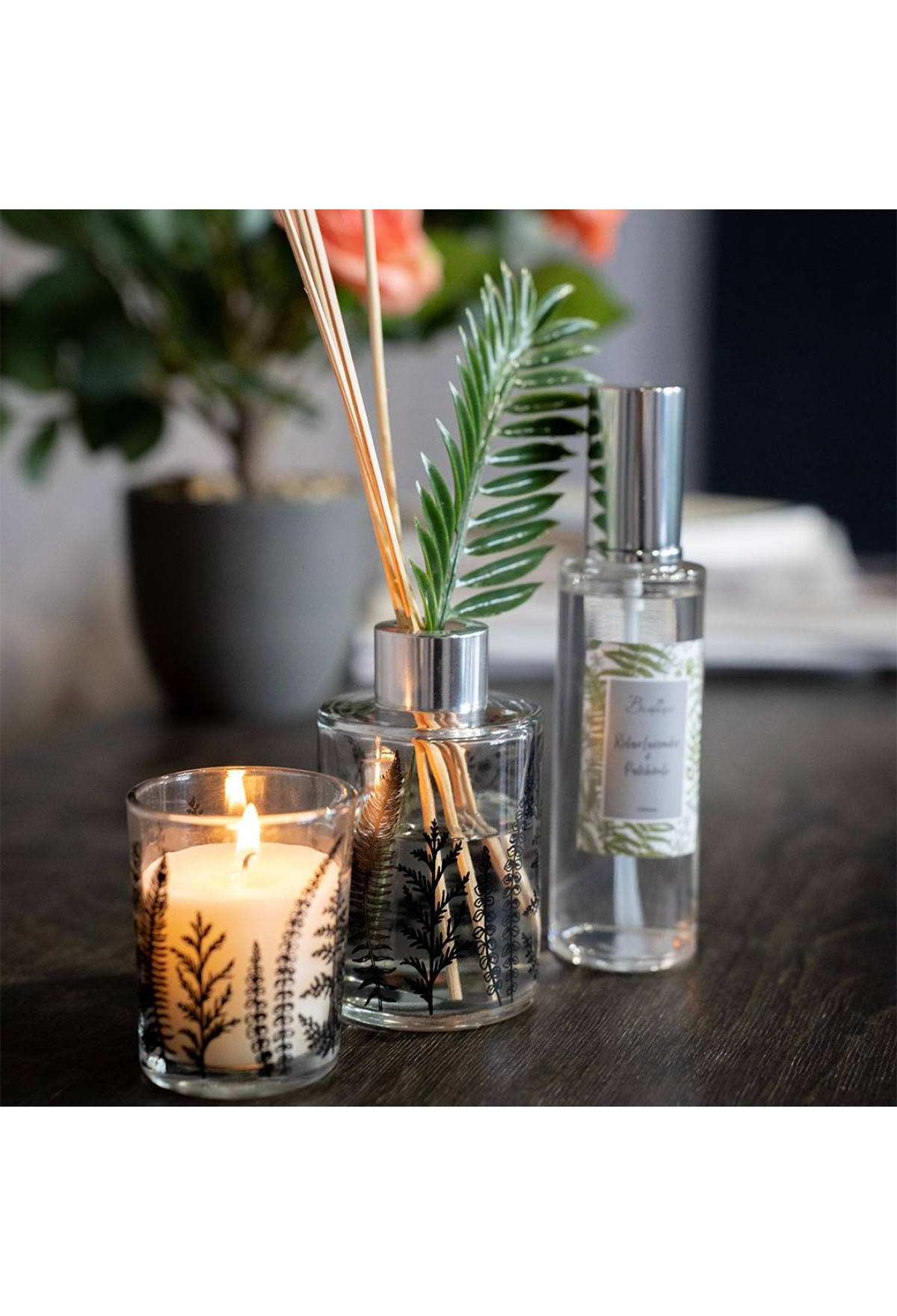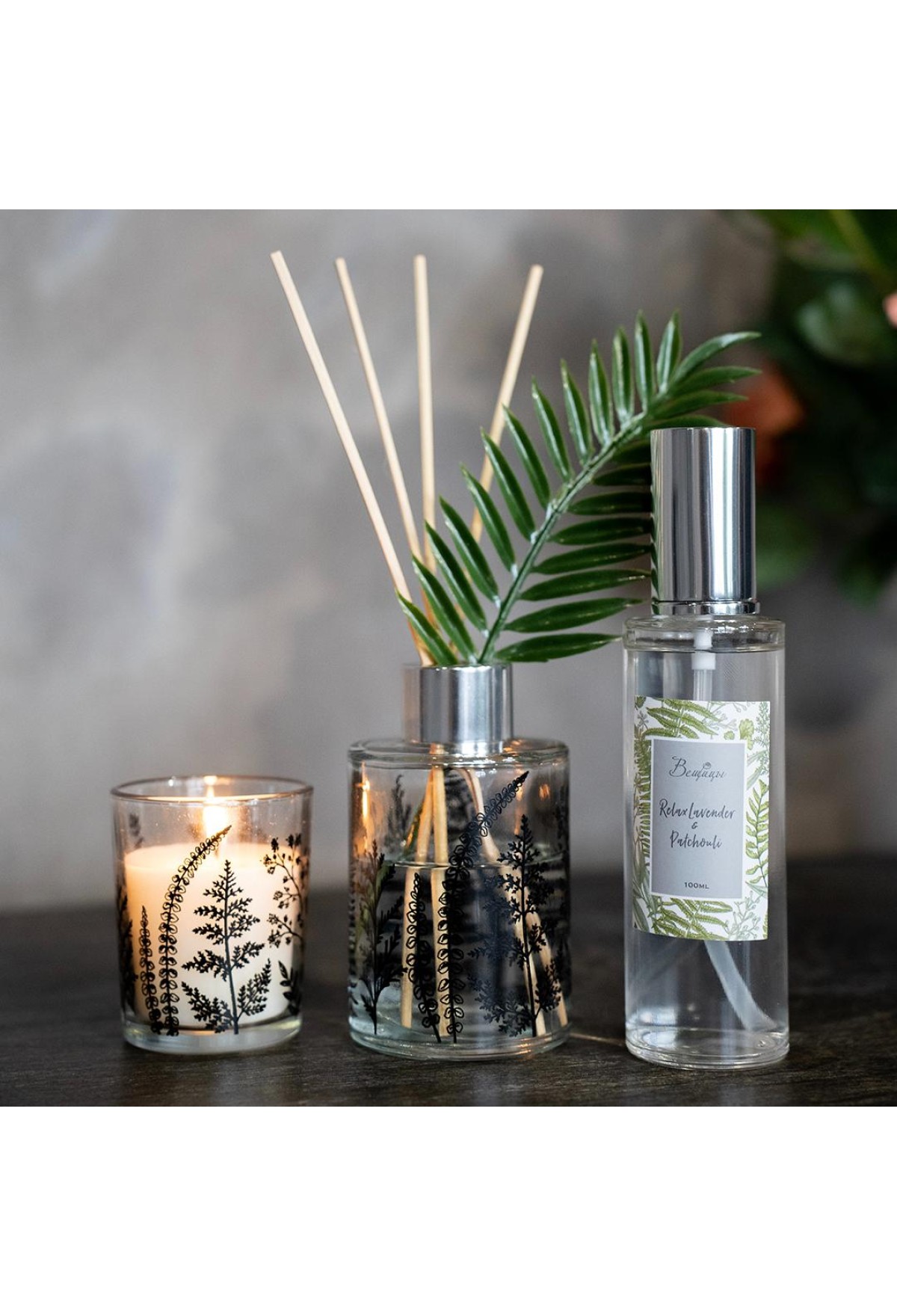 Аромат лаванды и пачули в сочетании создают неповторимую гармонию, которая обладает притягательной силой. Идеальный баланс между свежестью и теплом, спокойствием и таинством. Лаванда, с ее свежестью и легкостью, приносит ощущение спокойствия и чистоты. Ее неповторимый аромат, сочетающий в себе нотки свежести и пряности, освежает воздух и наполняет его энергией. Пачули, с другой стороны, придает этому сочетанию глубину и таинственность. Ее землистые и древесные ноты смешиваются с лавандой, создавая уникальную палитру аромата. Набор состоит из аромадиффузора объемом 80 мл, ароматического спрея 100 мл, палочек из ротанга в количестве 6 штук, ароматической свечи в стеклянном подсвечнике, декоративной веточки папоротника.