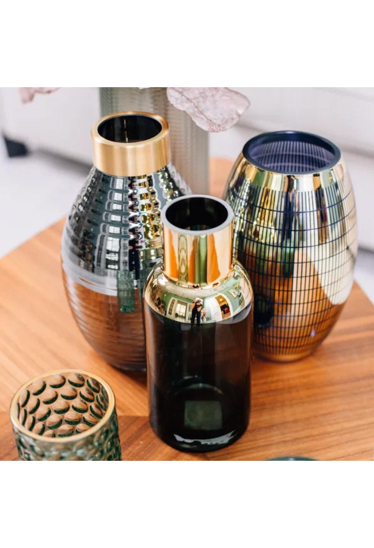 Покрытие нанесено качественно и смотрится дорого. Чтобы сохранить яркость напыления, протирайте вазу насухо после мойки. Источник теплого света, расположенный вблизи изделия, подсветит его достоинства: ребристые грани заиграют золотом.