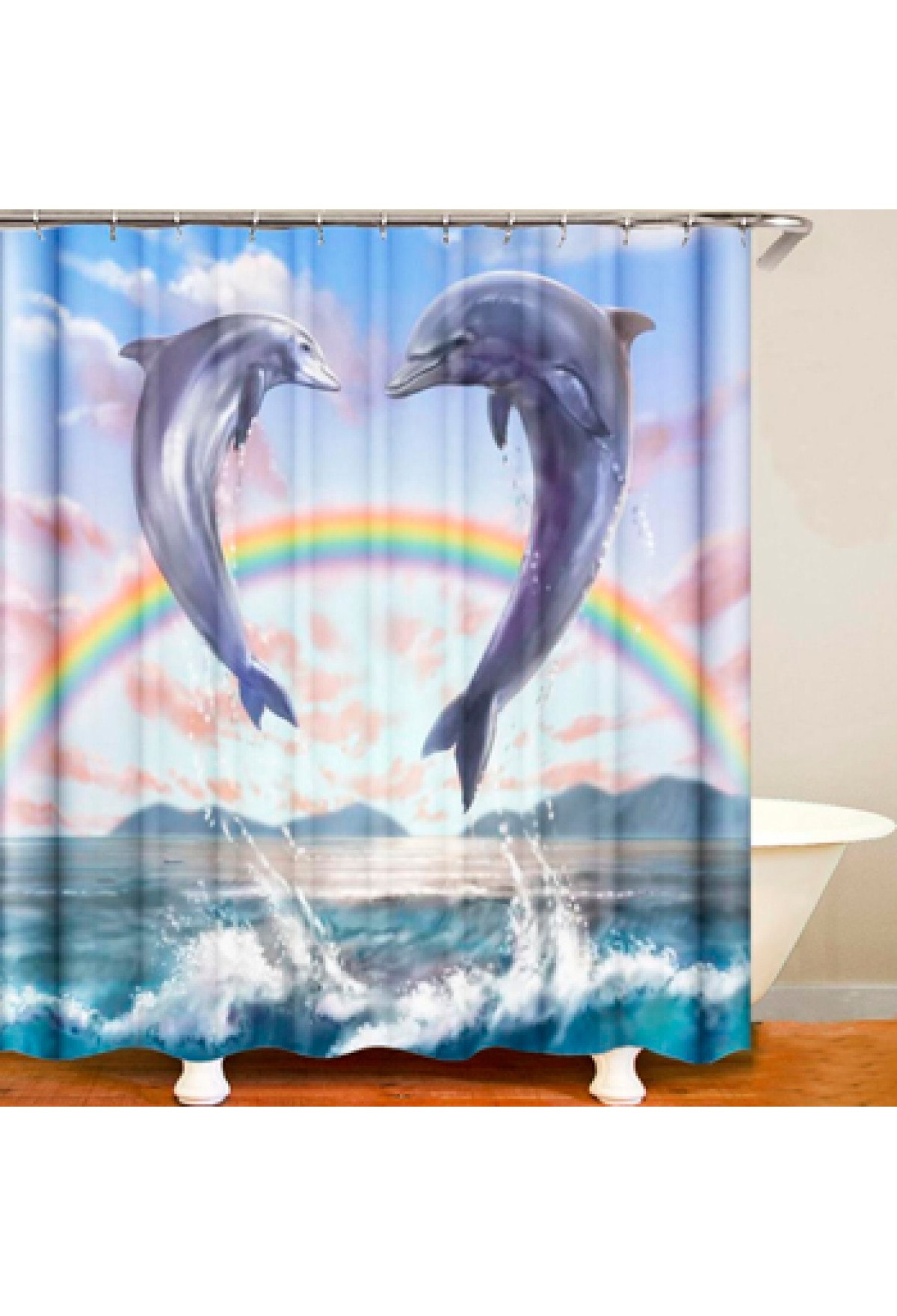Технические характеристики Штора для ванной комнаты с кольцами ФОТОПЕЧАТЬ 'Дельфины-4' 180х180