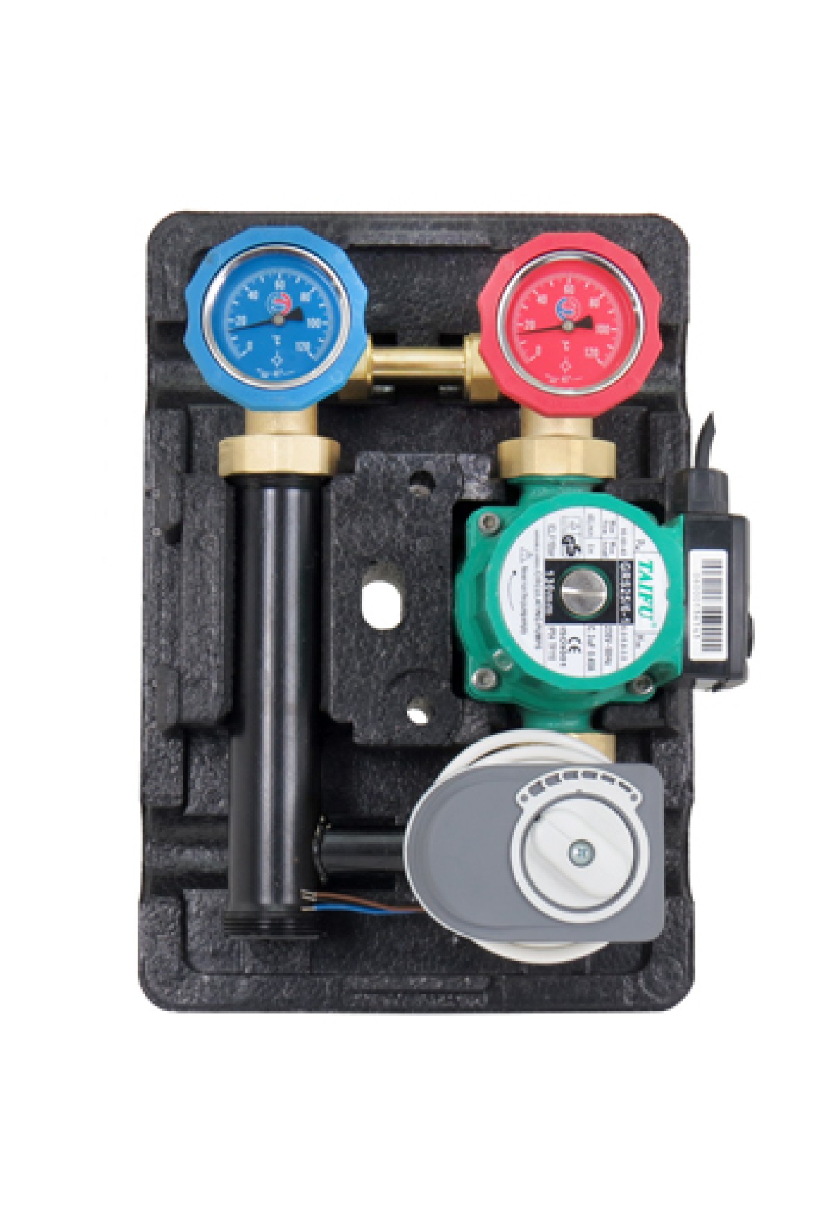 В комплекте | электронный термостат, трехходовые шаровые краны в подающей и обратной линиях; контактные термометры в подающей и обратной линиях; встроенный обратный клапан в запорном узле обратной линии; трехходовой смеситель со ступенчатым байпасом; съемная блочная, негорючая, раздельная термоизоляция |