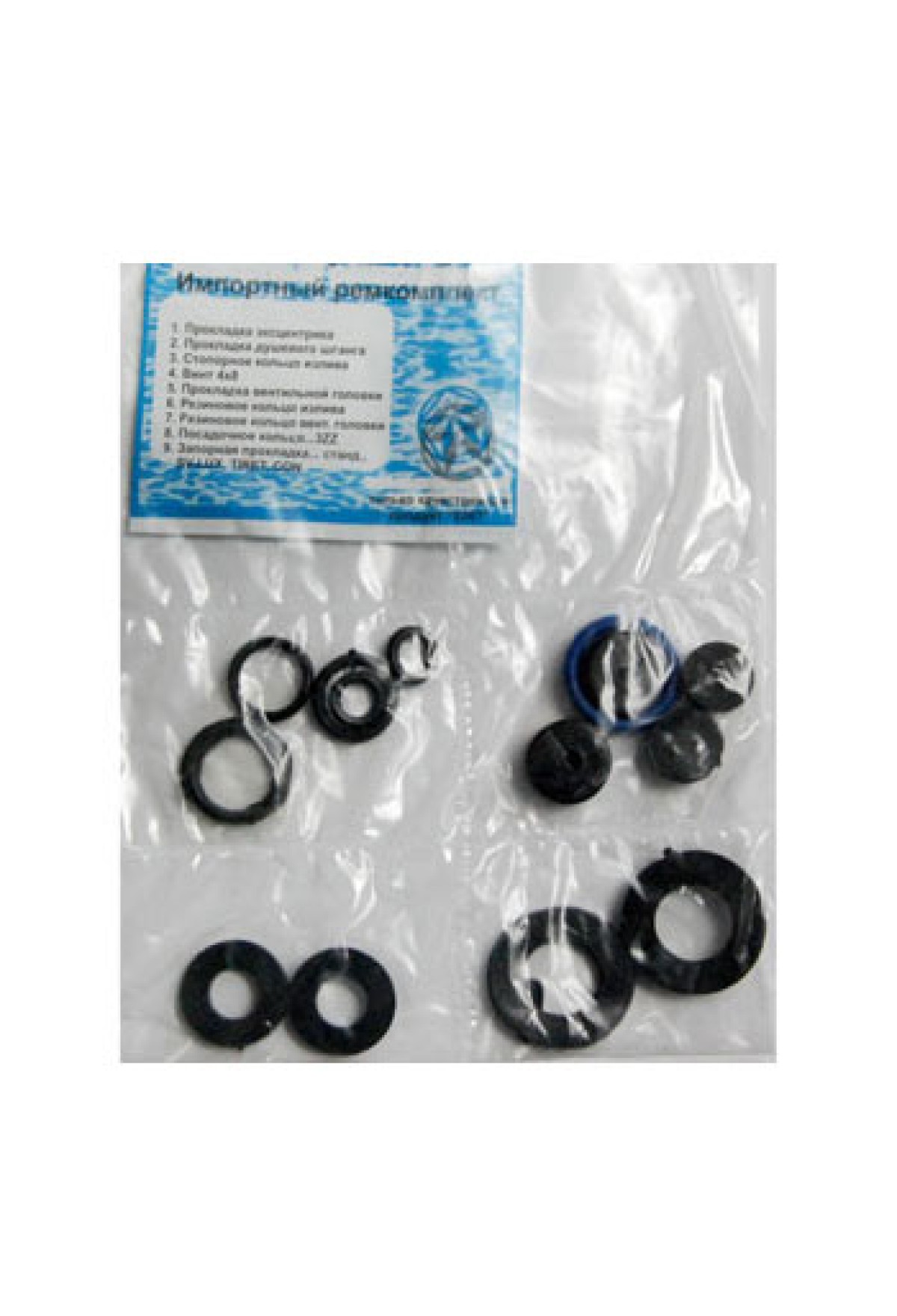 Комплектность | прокладка эксцентрика, прокладка душевого шланга, прокладка запорная, прокладка вентильной головки, резиновое кольцо вентильной головки, винт 4 х 8, стопорное кольцо излива, резиновое кольцо излива, кольцо посадочное |
