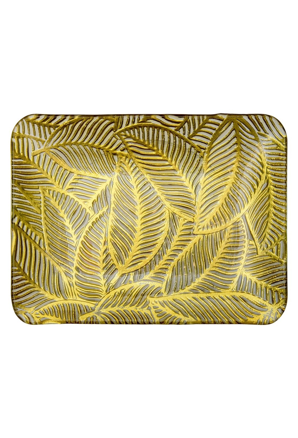 Блюдо стеклянное прямоугольное Листья, Д305 Ш225 В25, прозрачный, золотой