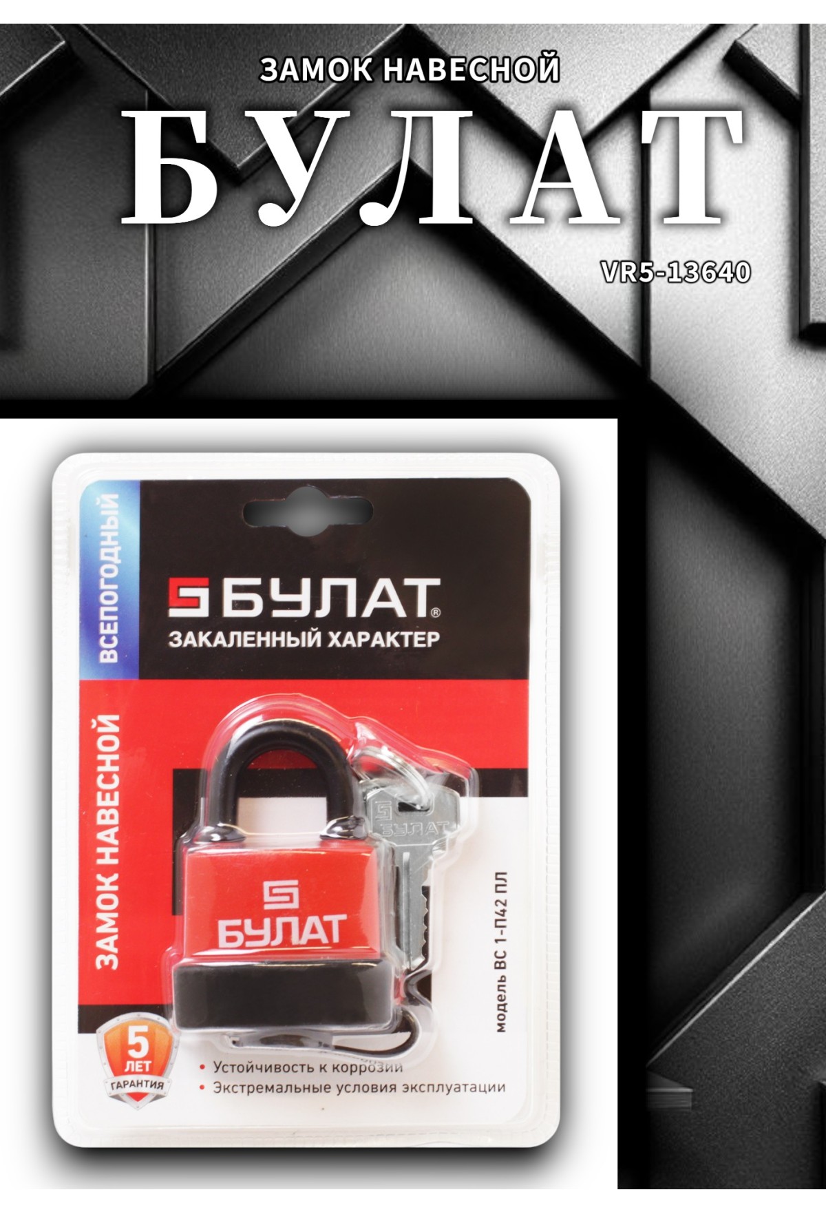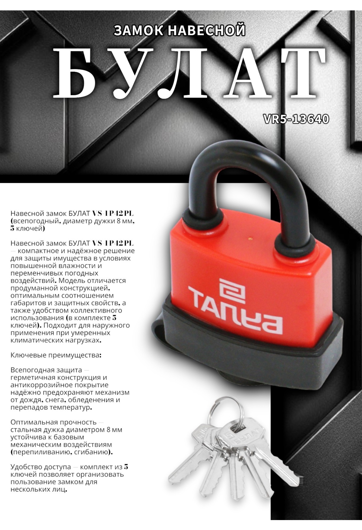 Навесной замок БУЛАТ VS‑1 P42 PL (всепогодный, диаметр дужки 8 мм, 5 ключей)