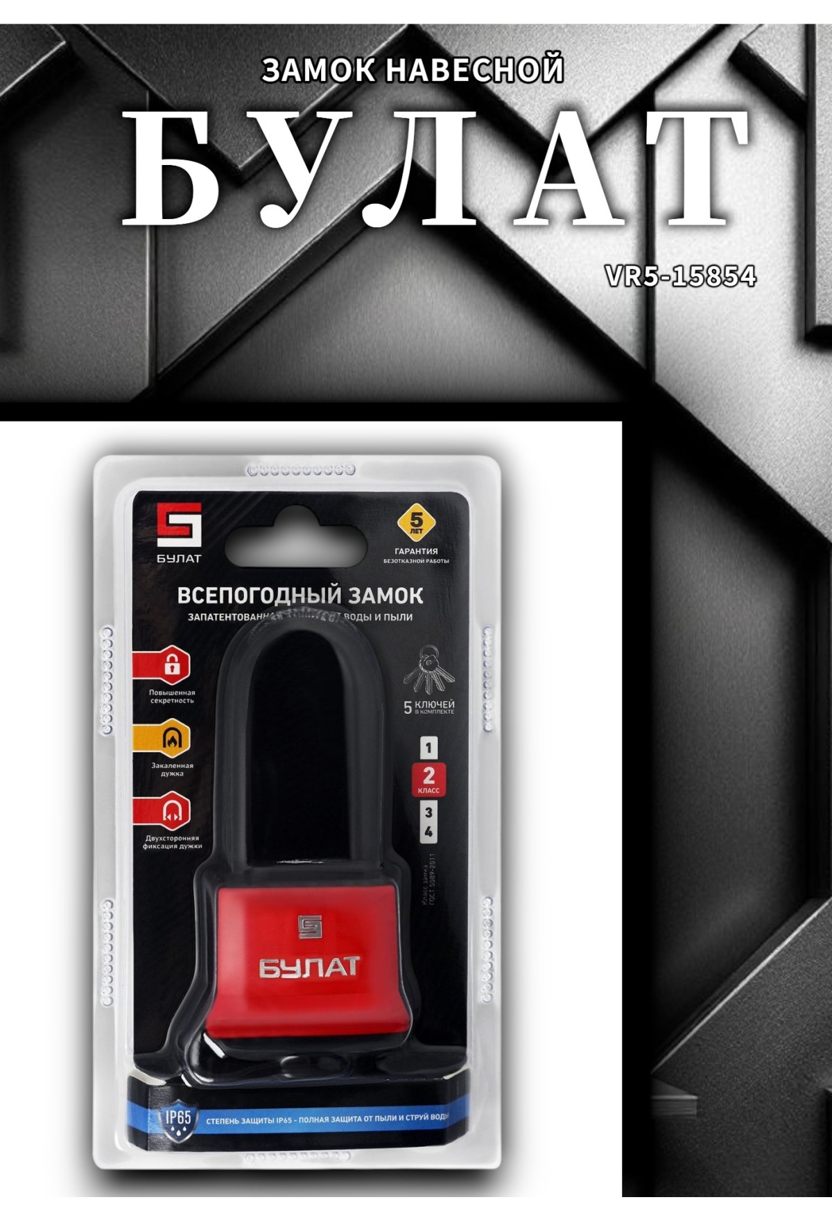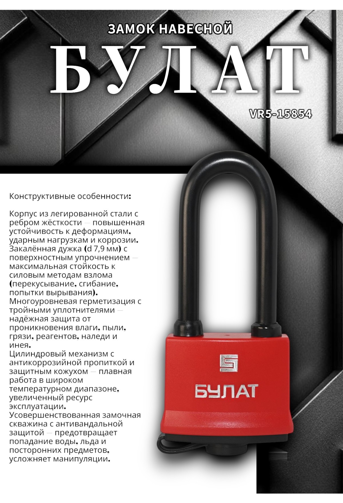 Навесной замок Bulat ВС 1‑П47‑01 ПЛ — усовершенствованная модель среднего уровня защиты с дужкой диаметром 7,9 мм. Разработан для эксплуатации в экстремальных климатических условиях: сохраняет работоспособность при температурах от −40 °C до +60 °C и влажности до 100 %. Отличается повышенной герметичностью, усиленной антикоррозийной защитой и улучшенной конструкцией ключевых узлов. Оптимален для объектов, где требуется баланс между взломостойкостью, долговечностью и устойчивостью к агрессивным внешним воздействиям.