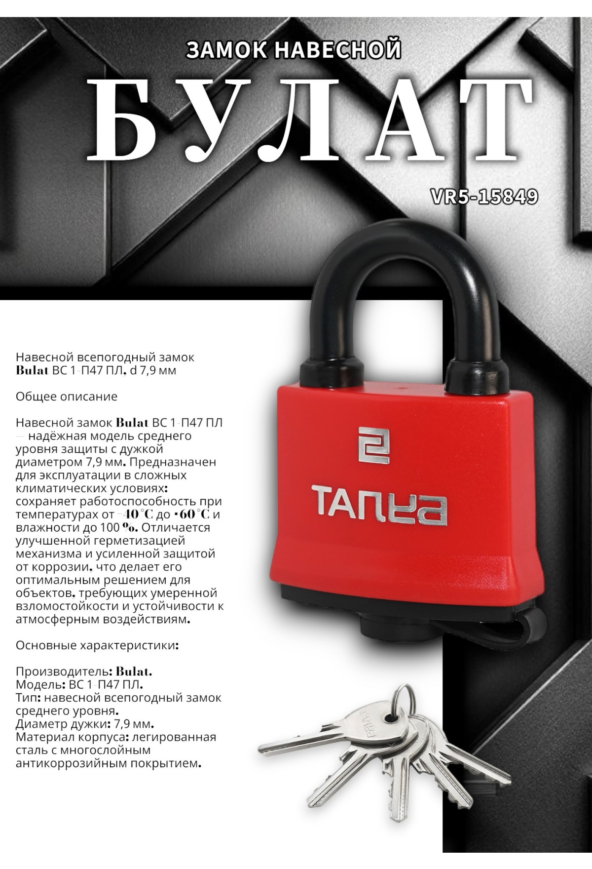 Навесной всепогодный замок Bulat ВС 1‑П47 ПЛ, d 7,9 мм