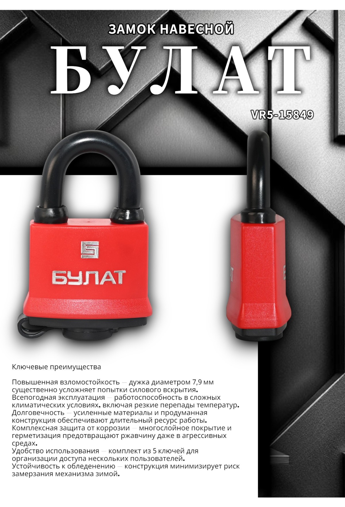 Повышенная взломостойкость — дужка диаметром 7,9 мм существенно усложняет попытки силового вскрытия.