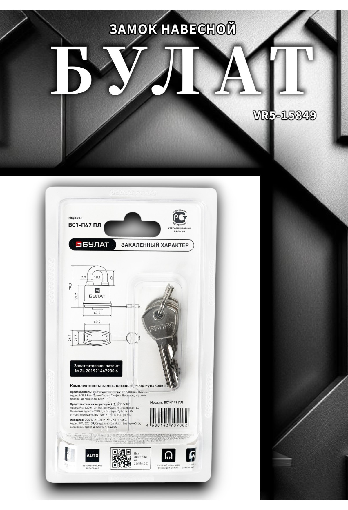 навесной замок Bulat ВС 1‑П47 ПЛ — 1 шт.;