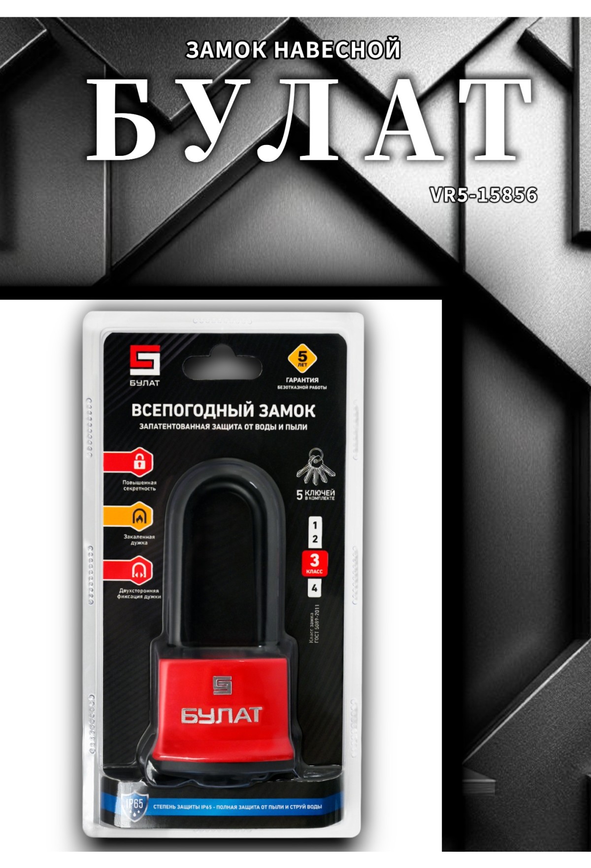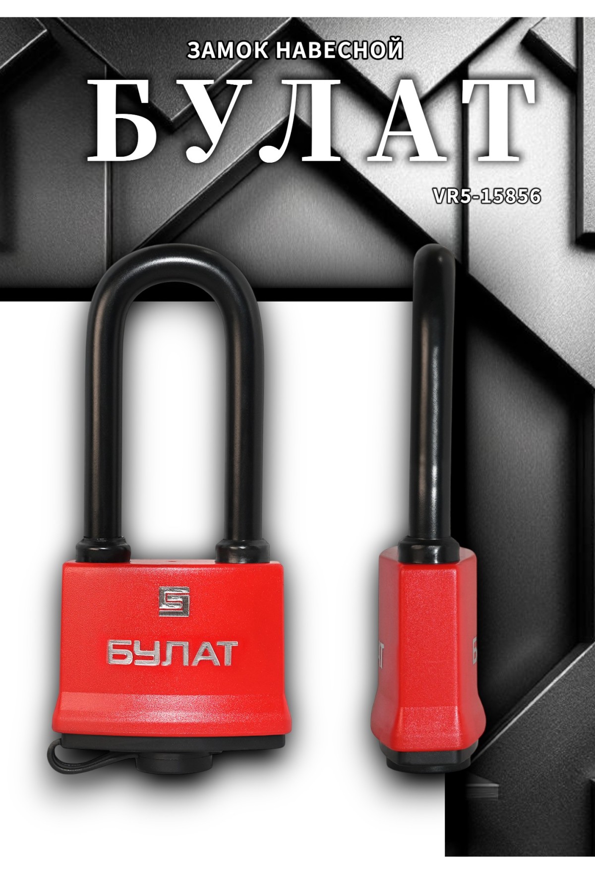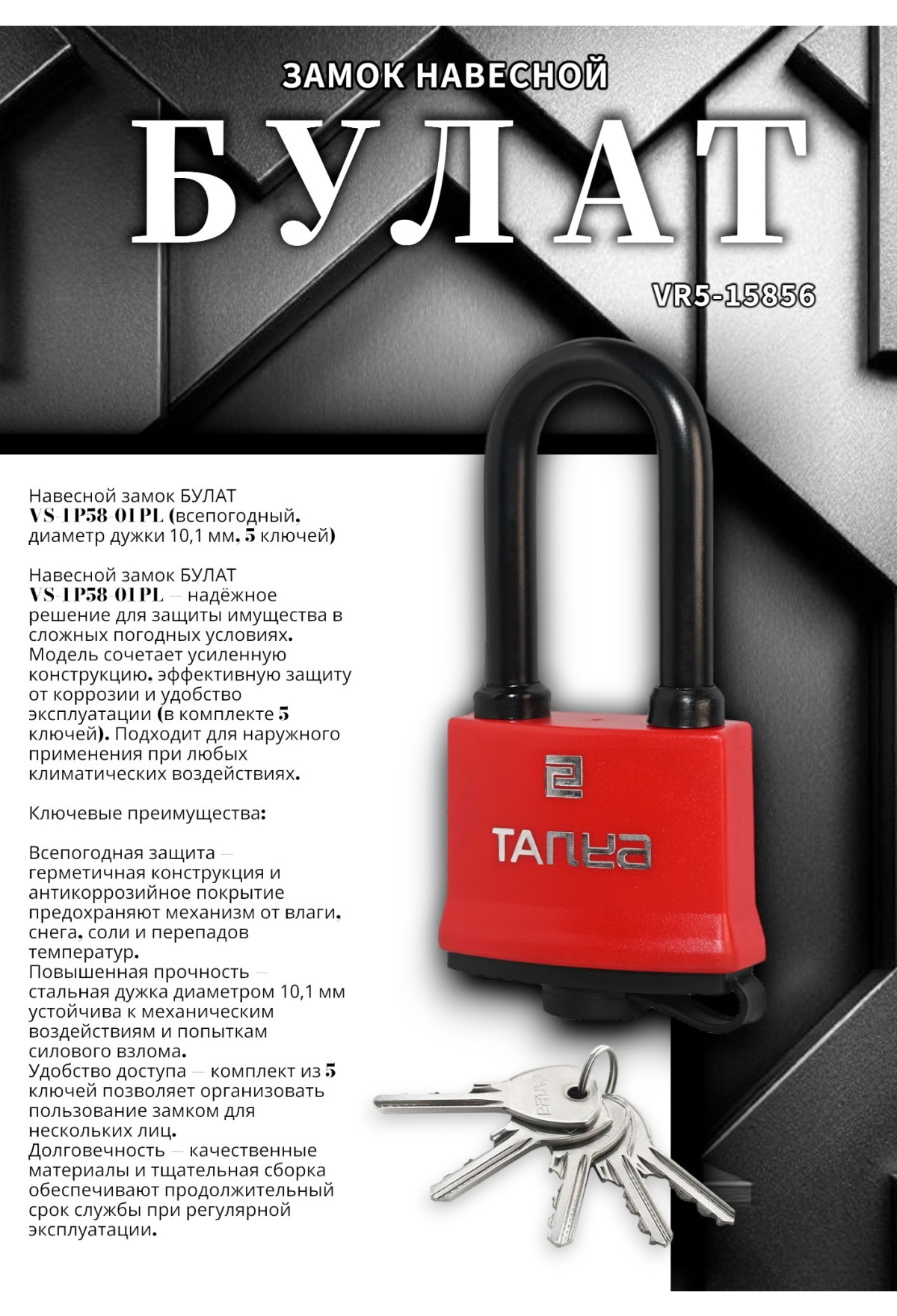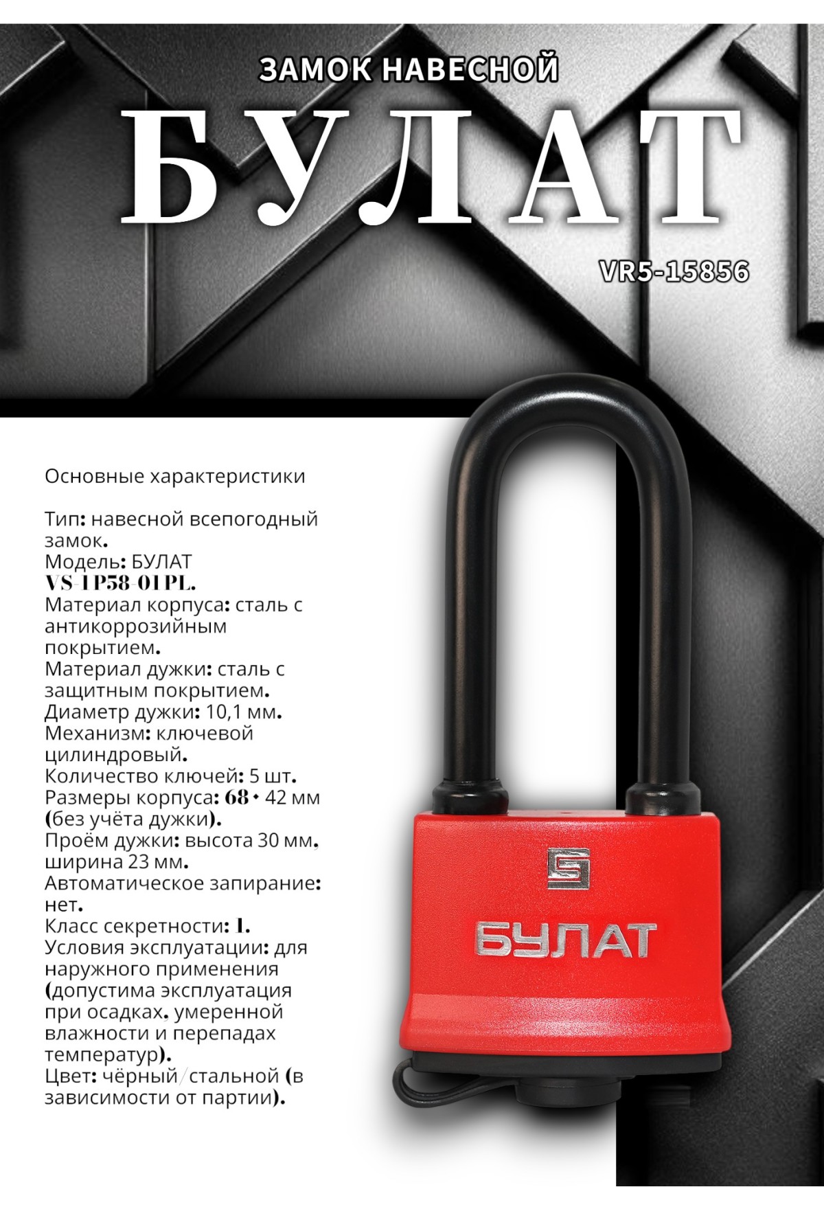 Навесной замок БУЛАТ VS‑1 P58‑01 PL (всепогодный, диаметр дужки 10,1 мм, 5 ключей)