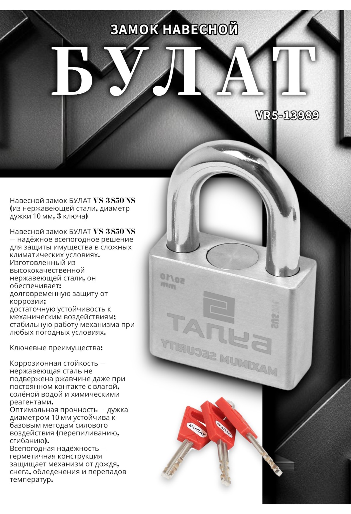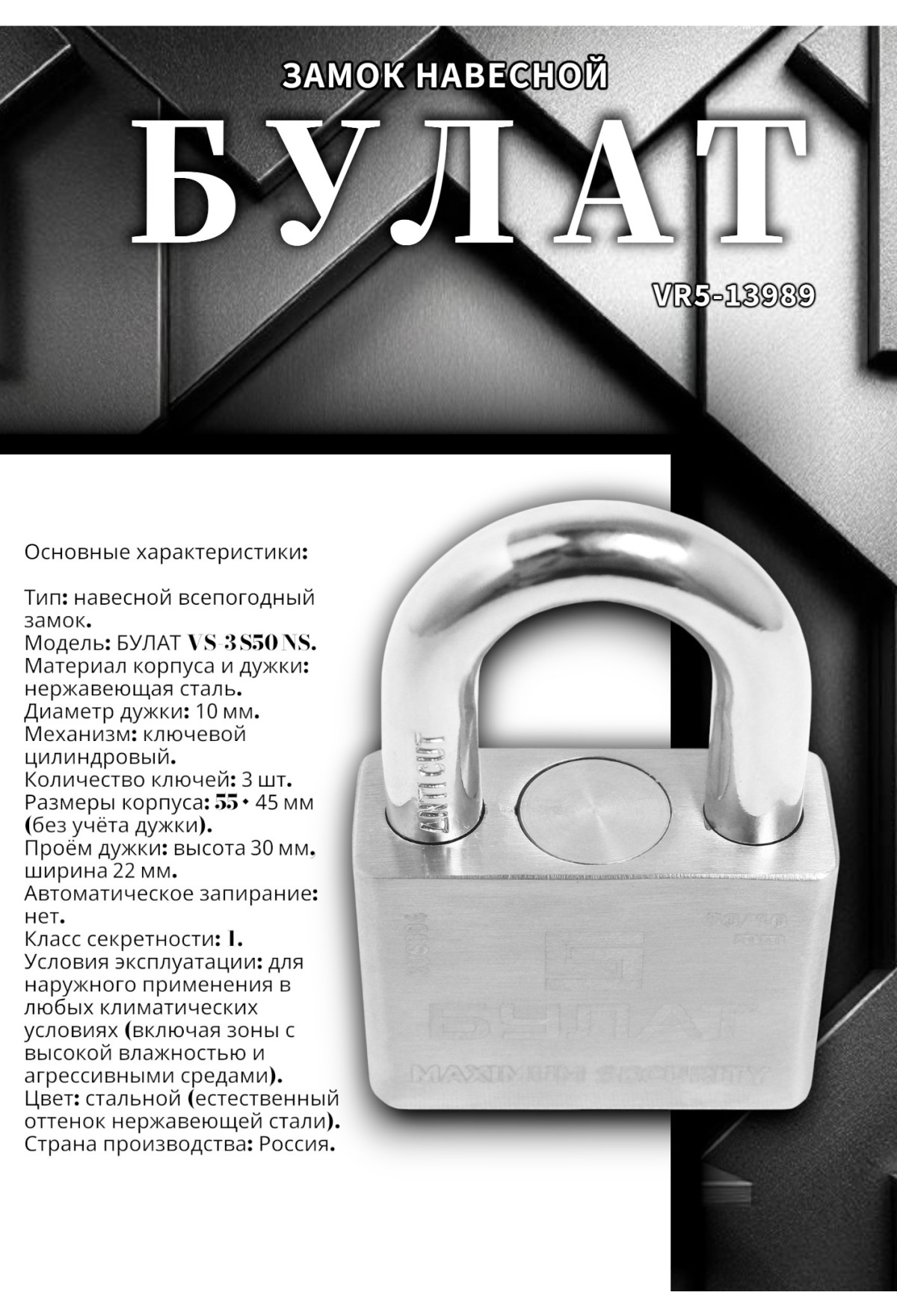 Навесной замок БУЛАТ VS‑3 S50 NS — надёжное всепогодное решение для защиты имущества в сложных климатических условиях. Изготовленный из высококачественной нержавеющей стали, он обеспечивает: