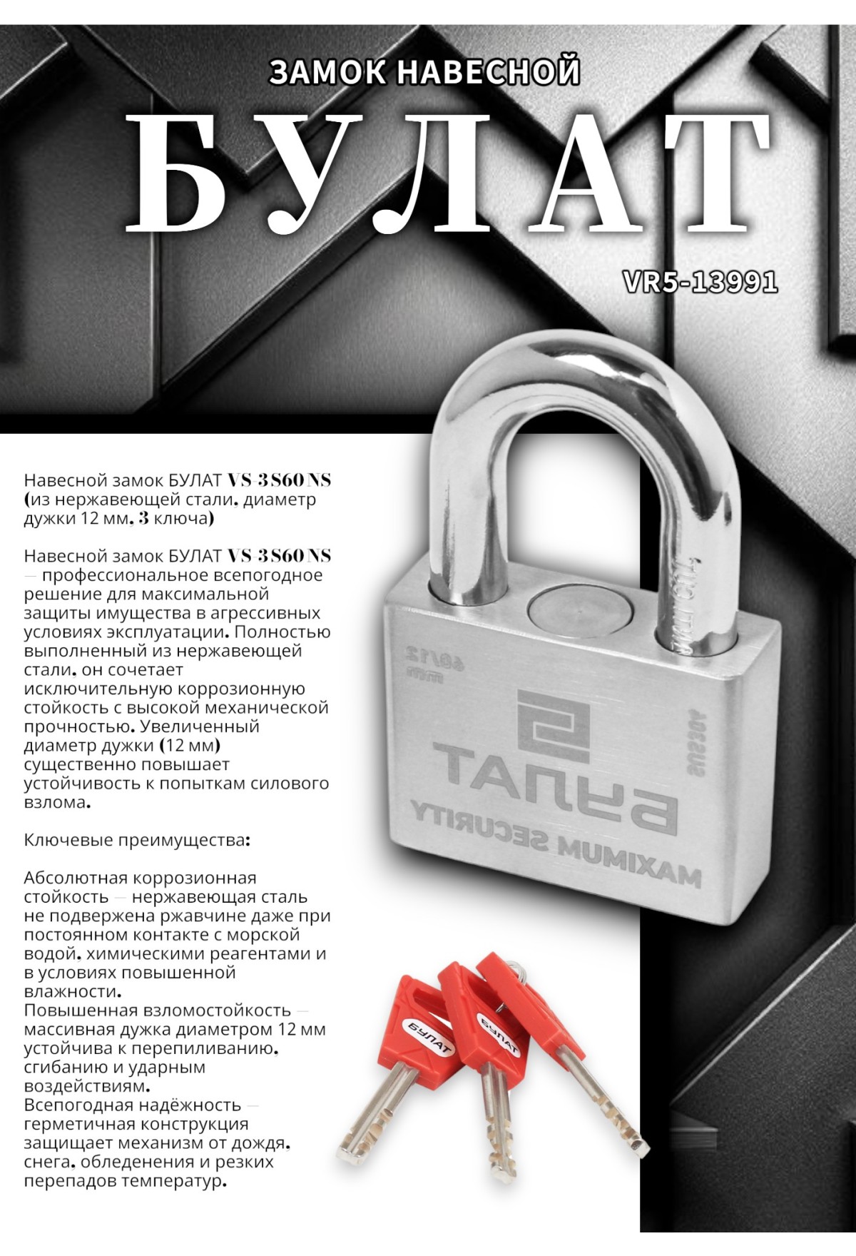 Навесной замок БУЛАТ VS‑3 S60 NS (из нержавеющей стали, диаметр дужки 12 мм, 3 ключа)
