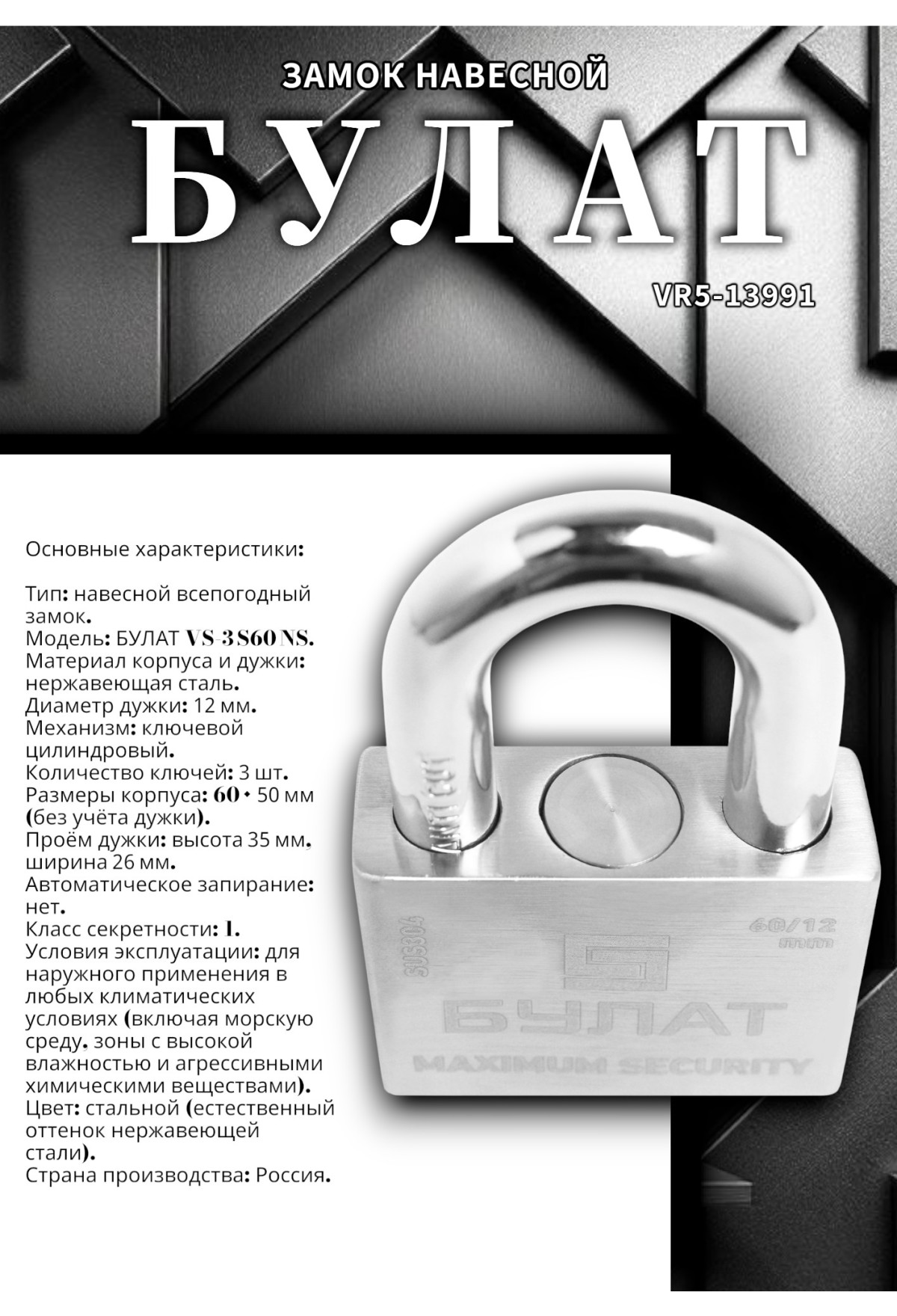 Навесной замок БУЛАТ VS‑3 S60 NS — профессиональное всепогодное решение для максимальной защиты имущества в агрессивных условиях эксплуатации. Полностью выполненный из нержавеющей стали, он сочетает исключительную коррозионную стойкость с высокой механической прочностью. Увеличенный диаметр дужки (12 мм) существенно повышает устойчивость к попыткам силового взлома.