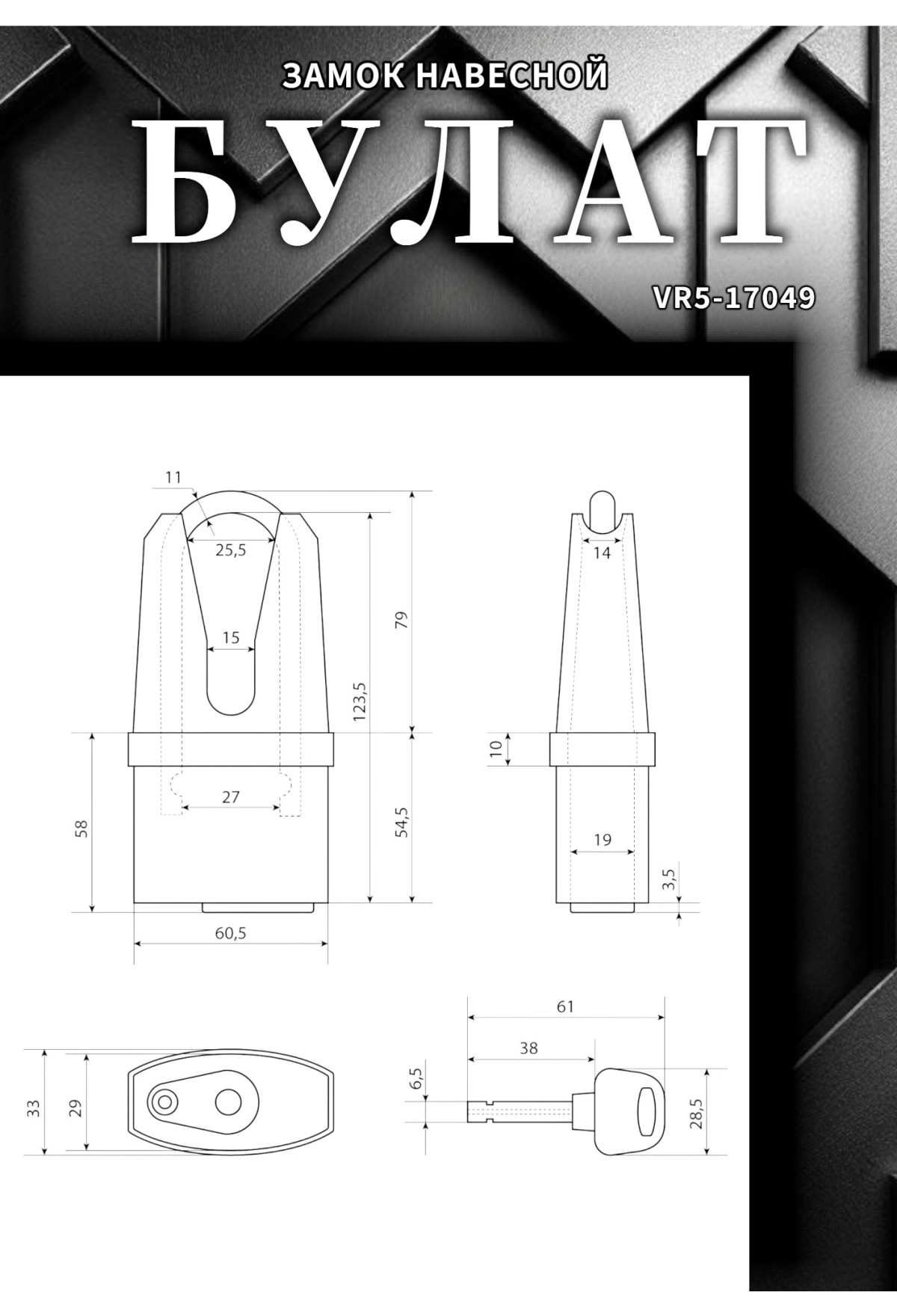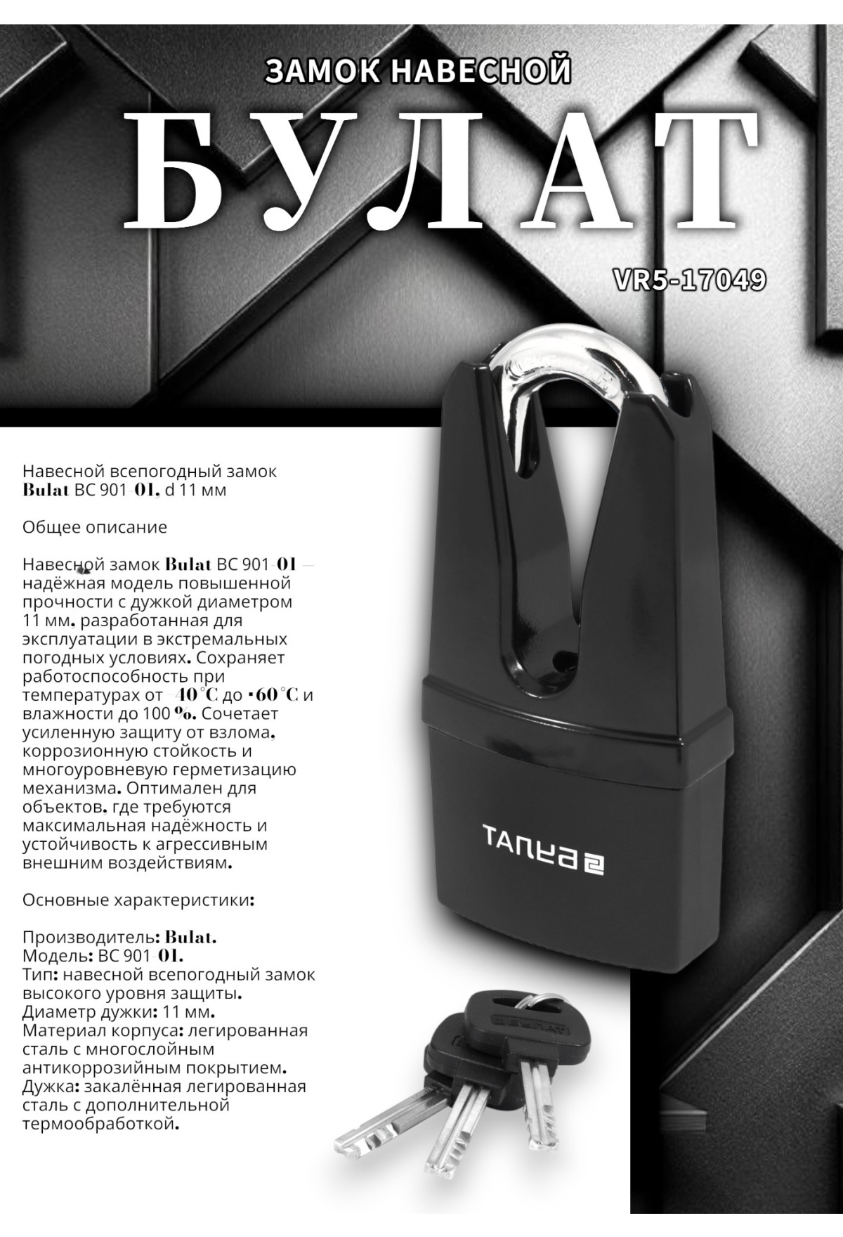 Технические характеристики БУЛАТ ВС 901-01 всепогодный 3 кл. d=11 мм Замок навесной (24,6)