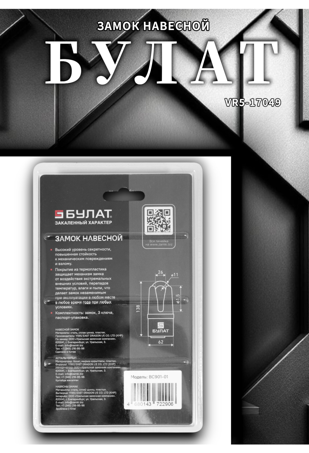 БУЛАТ ВС 901-01 всепогодный 3 кл. d=11 мм Замок навесной (24,6)