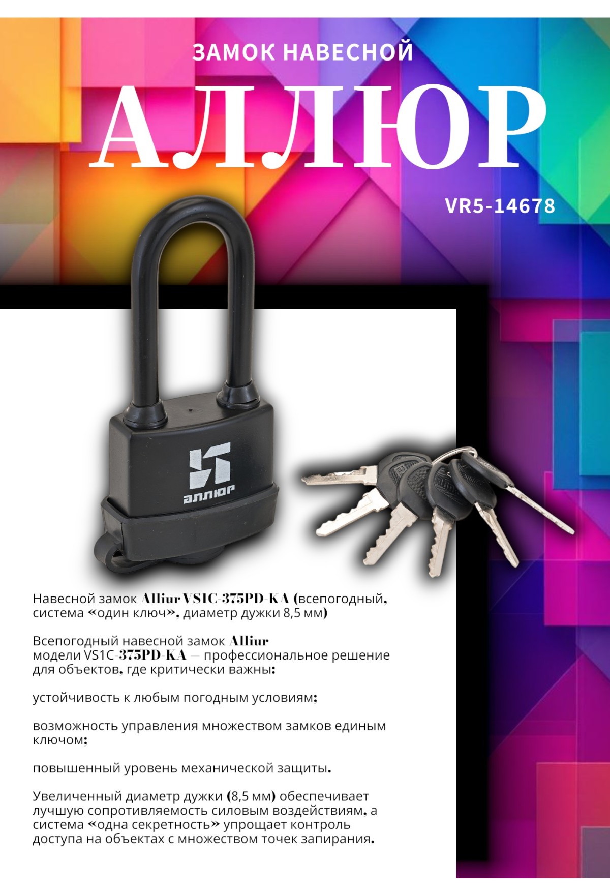 Навесной замок Alliur VS1C‑375PD‑KA (всепогодный, система «один ключ», диаметр дужки 8,5 мм)