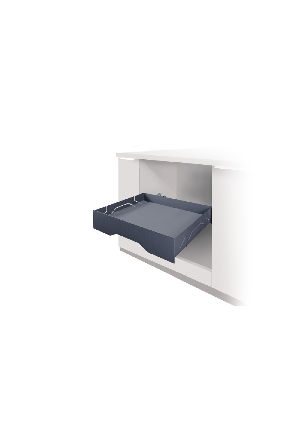 Выдвижной ящик впишется в пространство нижней кухонной базы, тумбы в ванной комнате или прихожей, в отдельно стоящие модули или пеналы за распашными фасадами. Предназначен для плит толщиной 16 и 18 мм.