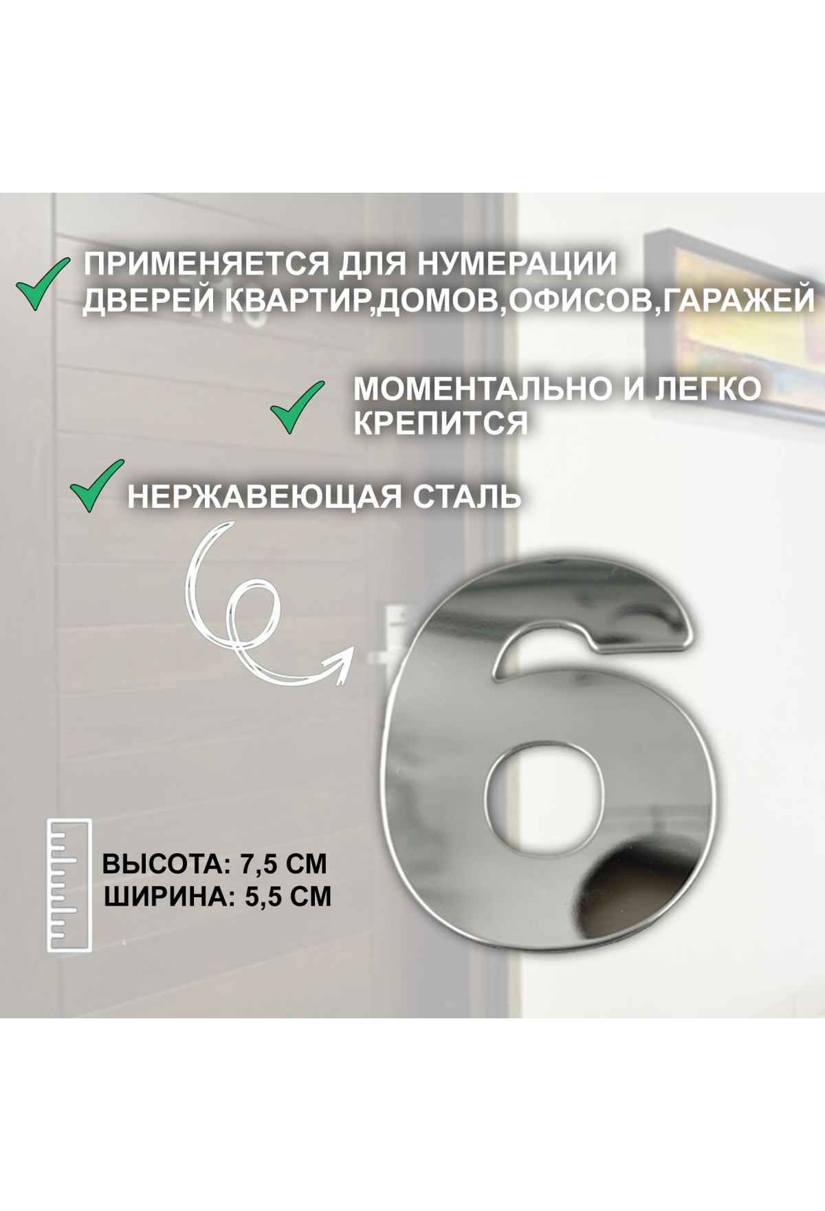 Дверная цифра предназначена для маркировки нумерации квартир, гостиничных или санаторных номеров, кабинетов в офисах и учреждениях. Цифра металлическая изготовлена из метала , которая надолго сохраняет привлекательный внешний вид.