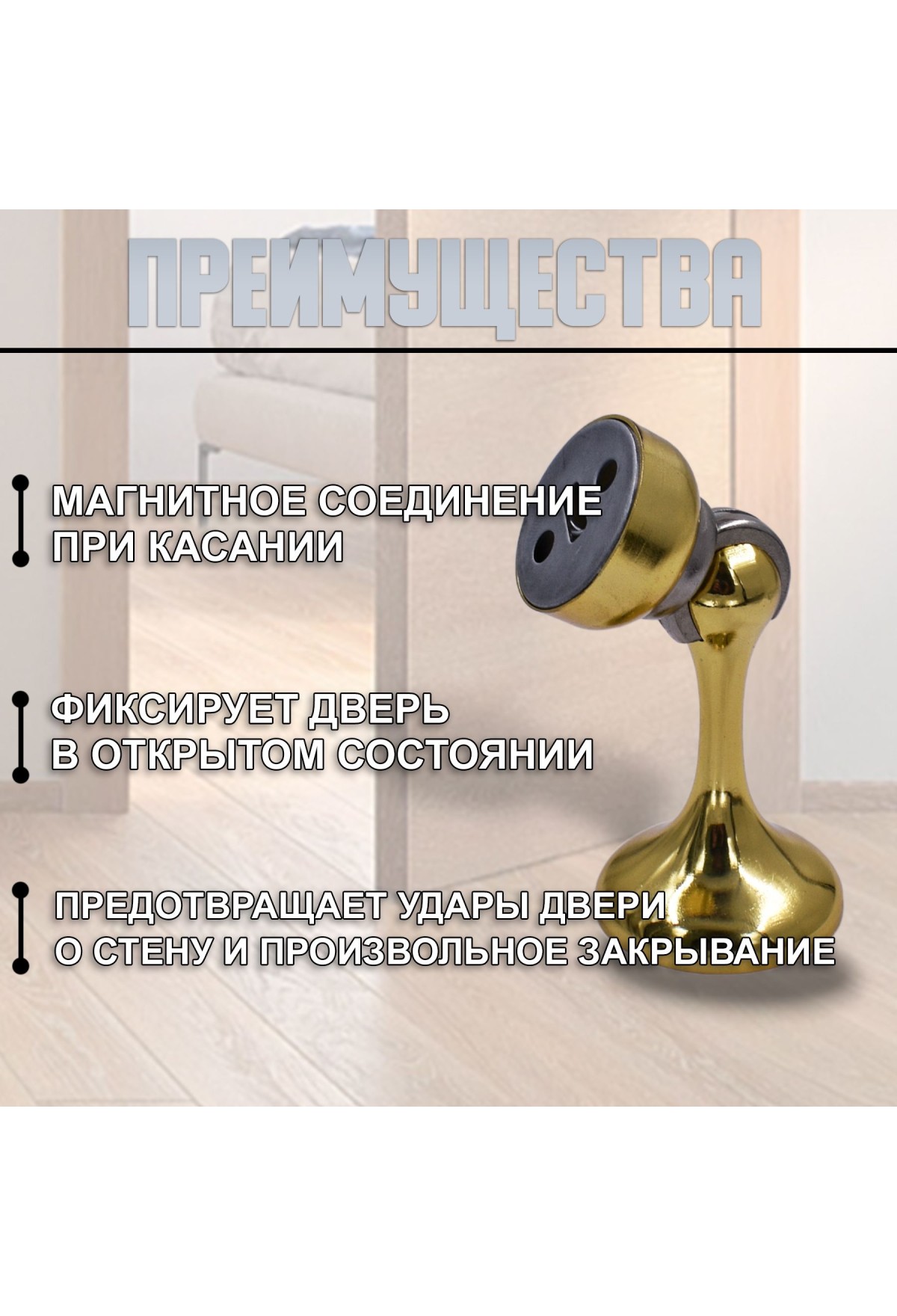 Этот инновационный напольный ограничитель позволит вам избежать повреждений вашей двери и защитить стену от нежелательных отметин. Упор для дверей имеет сильный магнитный механизм, который надежно фиксирует дверь и предотвращает ее несанкционированное движение. Крепится фиксатор дверной магнитный очень просто и быстро, не требуя дополнительного инструмента или технических навыков.