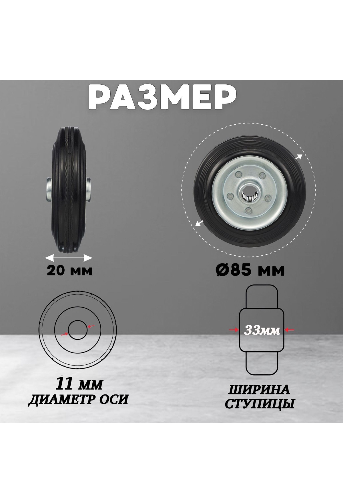 ХБ Колёса для тележки промышленные под ось 2 шт, без кронштейна, 85 мм, резина