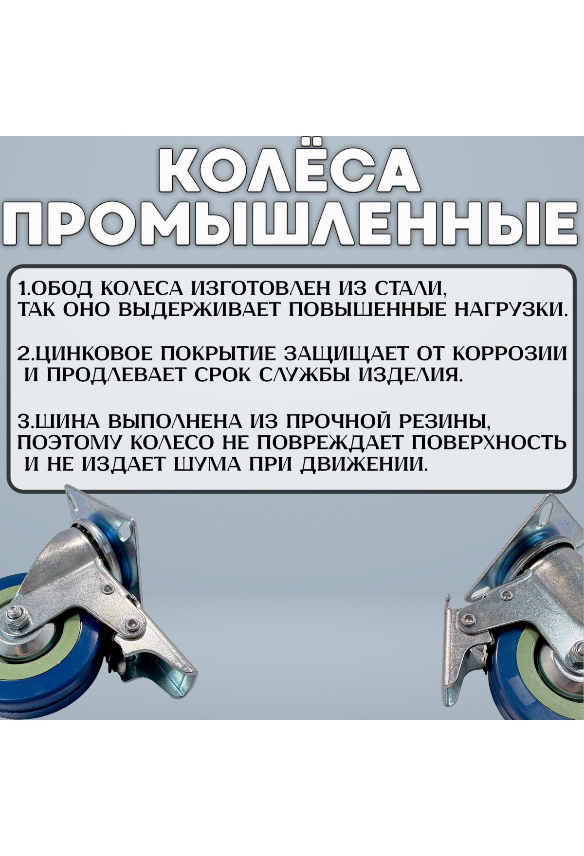 Основание изготовлено из оцинкованной стали, промышленные колеса из резины премиум качества, благодаря этому они обладают повышенной износостойкостью и отлично поглощают вибрацию.
