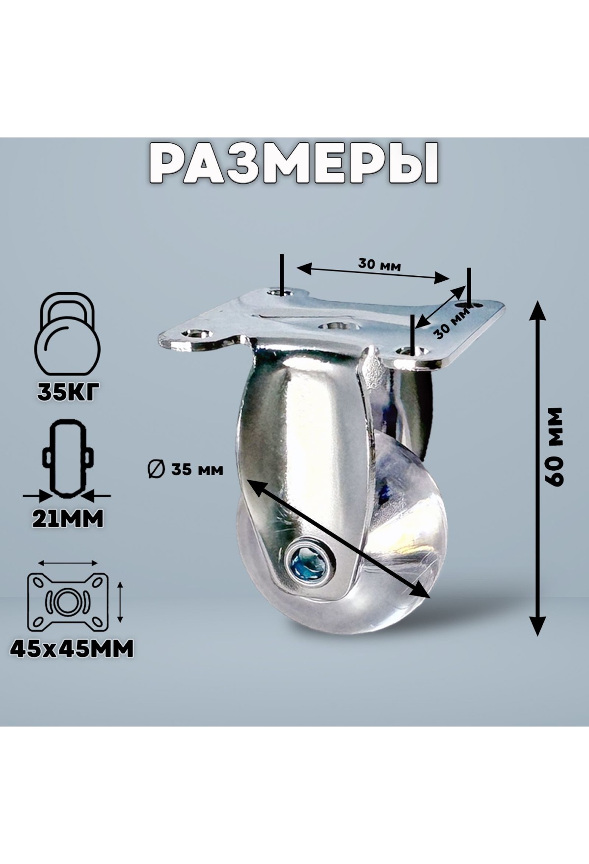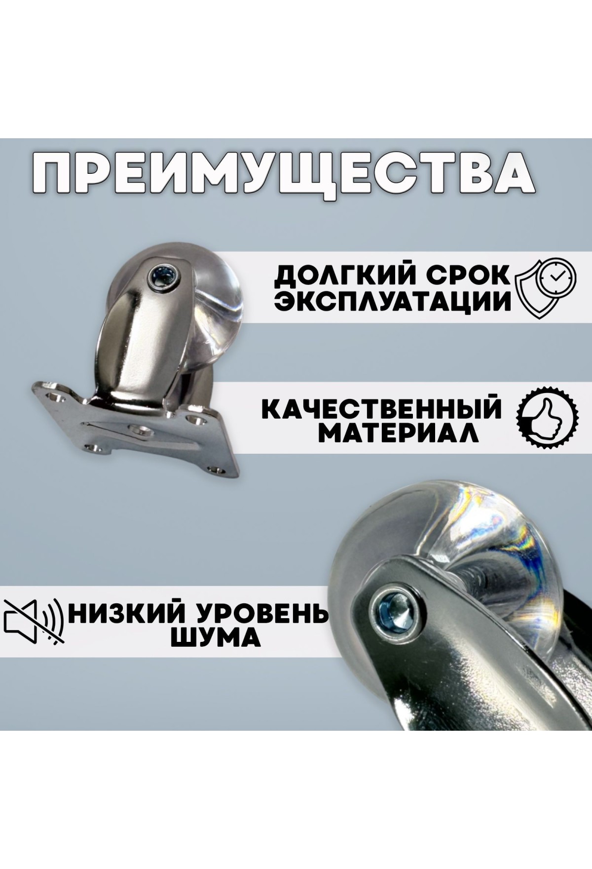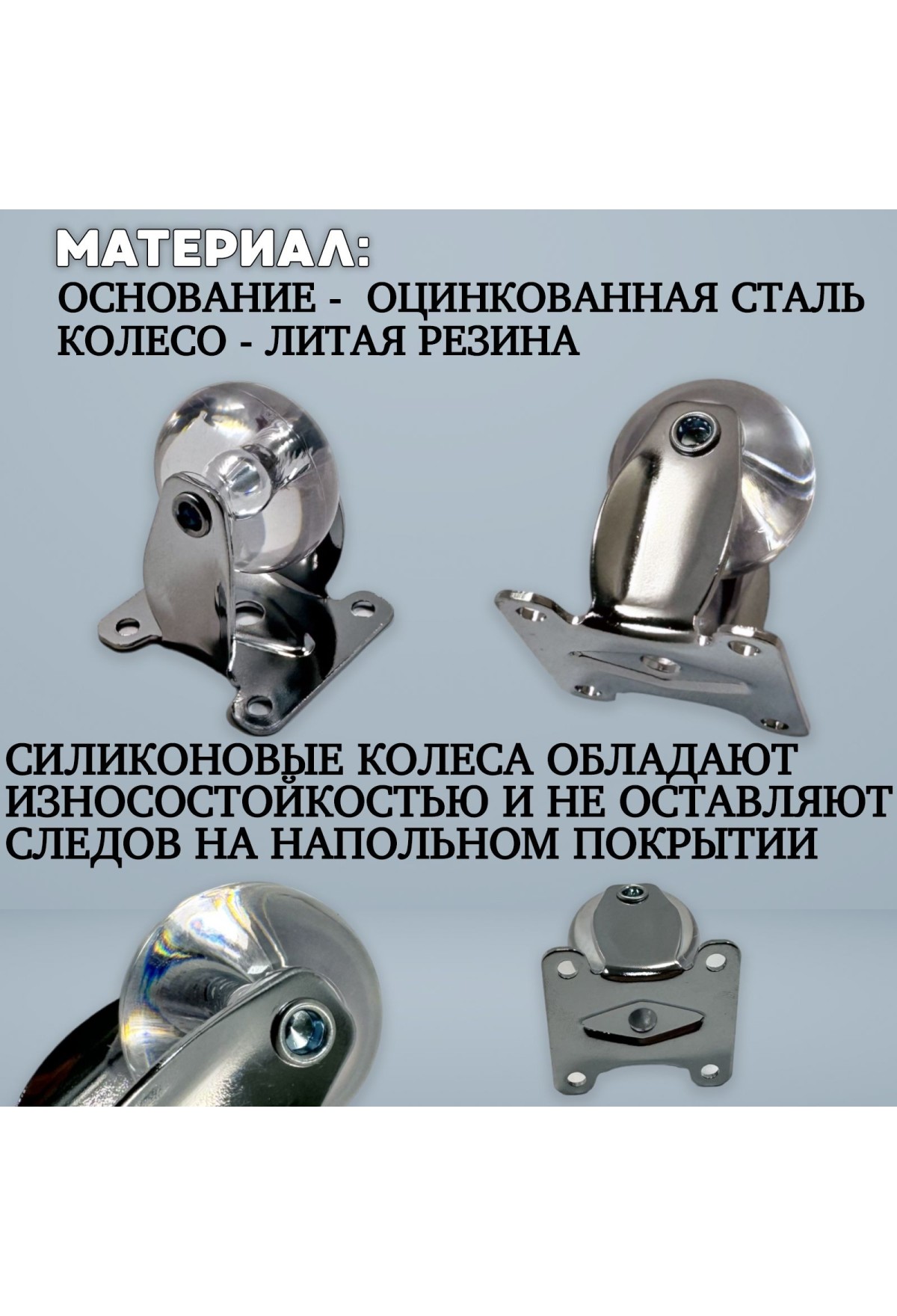 Прозрачные колеса подходят для различных типов мебели, включая столы, стулья, диваны и шкафы. Легко устанавливаются посредством металлической пластины (площадки) и обеспечивают надежное крепление, что делает их идеальным выбором для любой мебели.