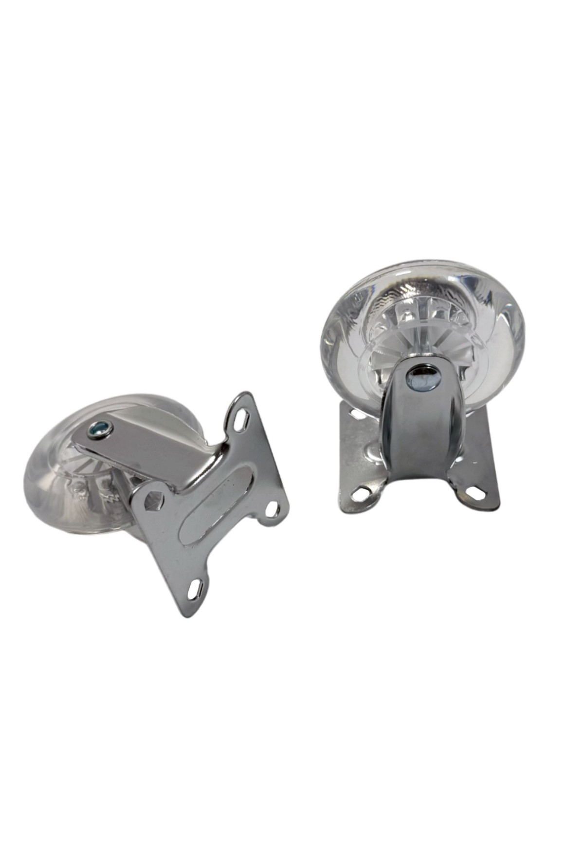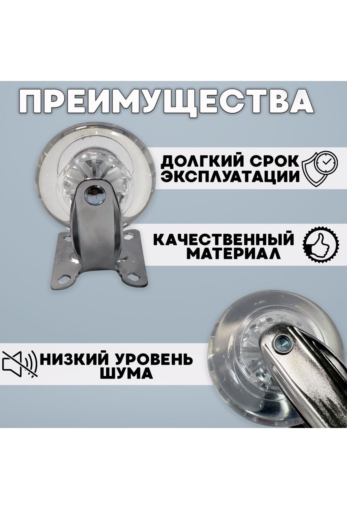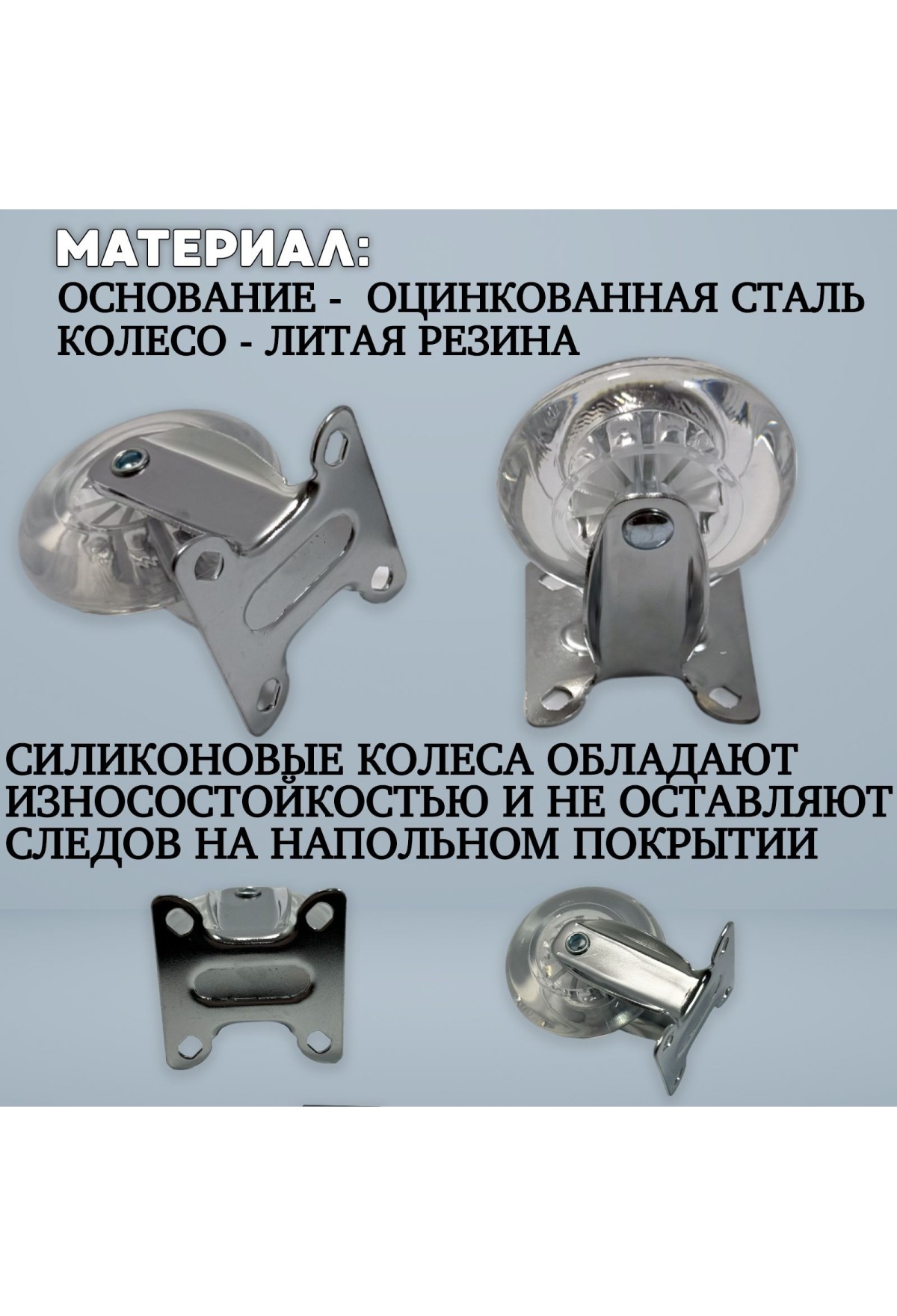 Прозрачные колеса подходят для различных типов мебели, включая столы, стулья, диваны и шкафы. Легко устанавливаются посредством металлической пластины (площадки) и обеспечивают надежное крепление, что делает их идеальным выбором для любой мебели.