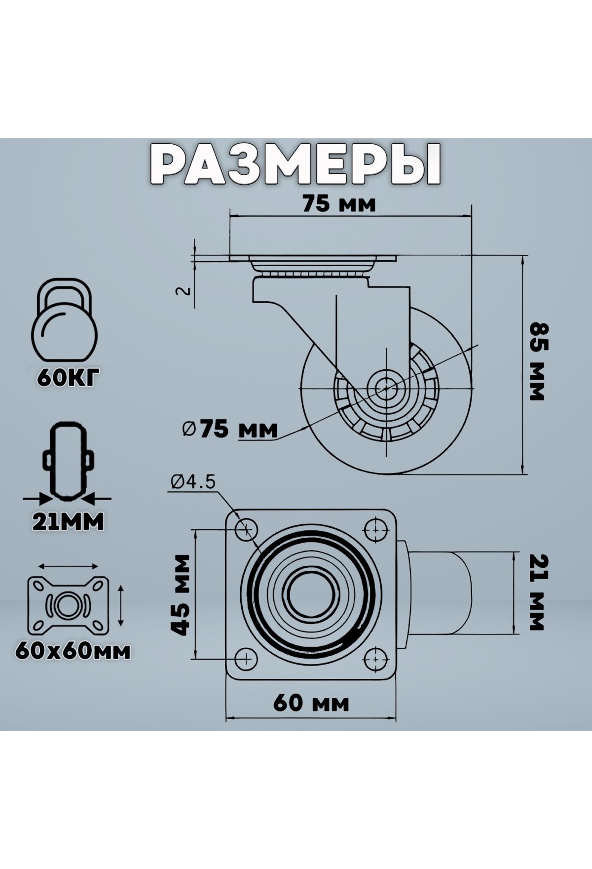 Колеса мебельные поворотные 75мм, премиум класса -усиленные (одно колесо выдерживает вес до 60кг) .