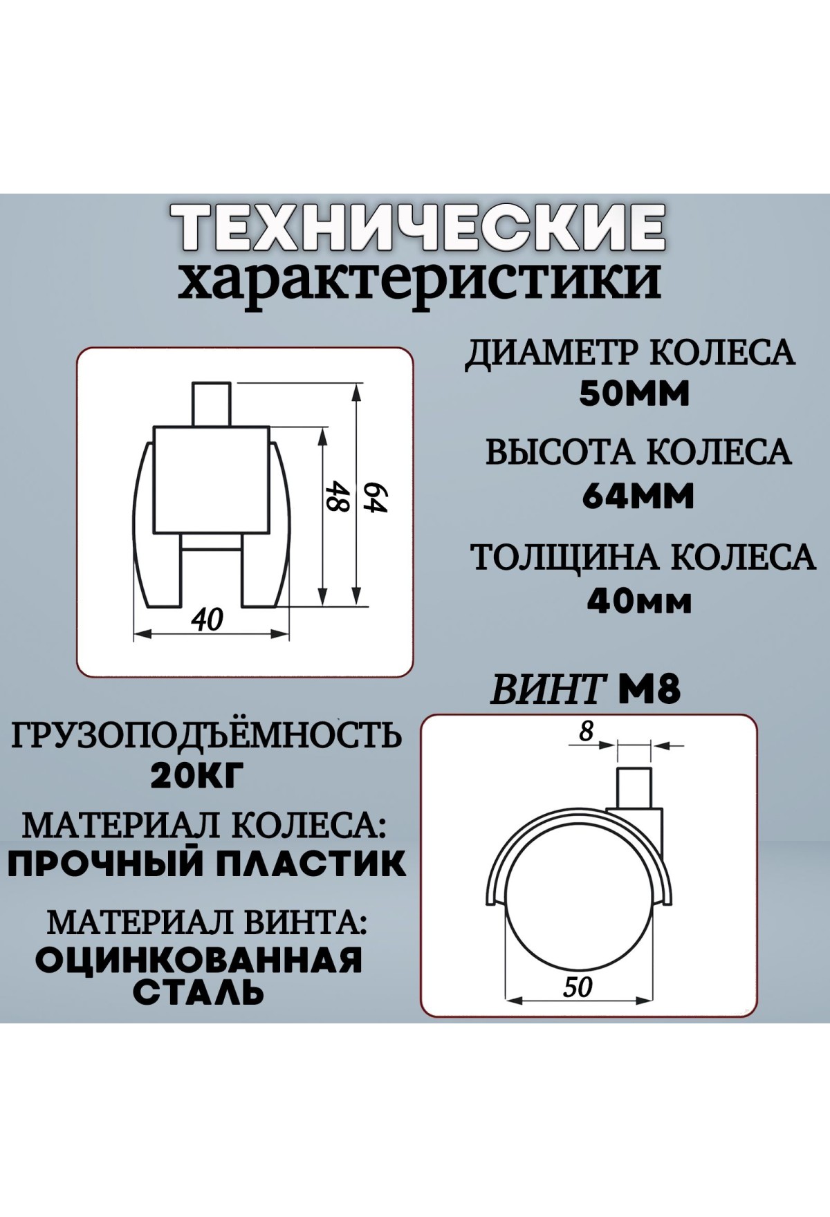 Поворотное колесо мебельное диаметром 50 мм( с тормозом) на резьбе м-8мм представляет собой фурнитуру для мебельной промышленности. Колесо поворотное Выдерживает нагрузку до 25 кг на одно колесо и до 100кг на 4 колеса. Используется на паркетах и ламинатах. Не царапает поверхность, бесшумность, надежность.