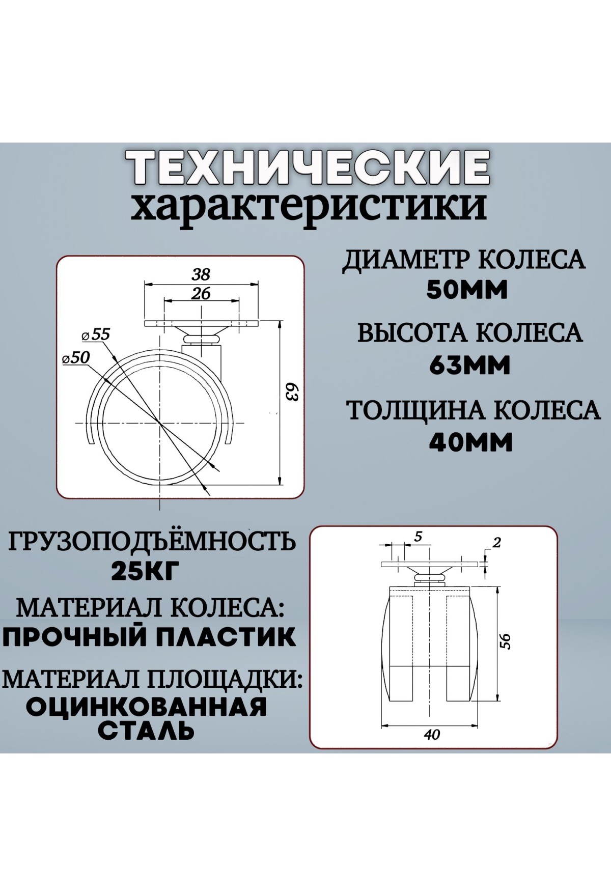 Поворотное колесо диаметром 50мм представляет собой фурнитуру для мебельной промышленности. Выдерживает нагрузку до 50 кг и до 100кг на все 4 колеса. Колесо поворотное с тормозом Используется на паркетах и ламинатах. Не царапает поверхность, бесшумные, надежные.